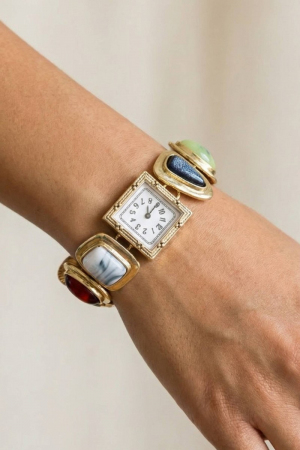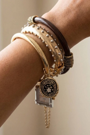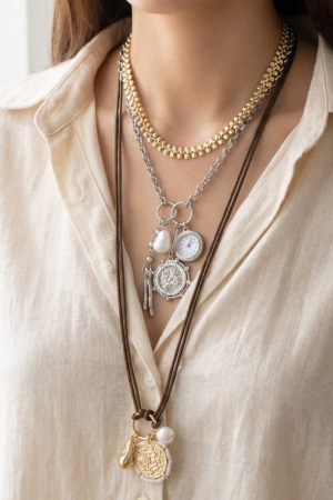 Mixed Metal Layered Charm Ribbon Tie With Watch Necklace