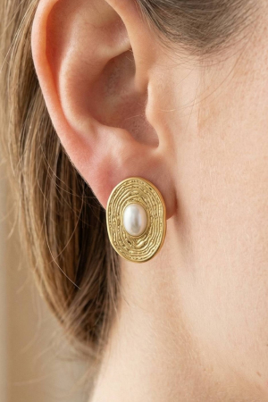 Gold Dipped Textured Oval Frame Pearl Center Stud Earrings