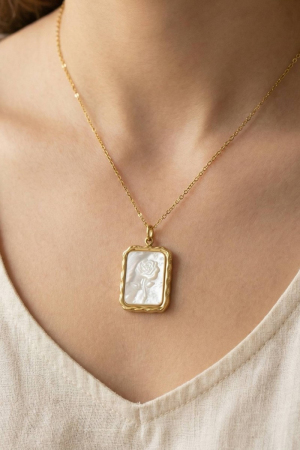 Mother Of Pearl Rose Rectangle Pendant Necklace