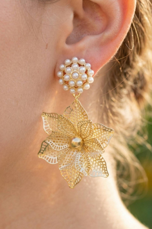 Gold Filigree Flower & Pearl Bow Drop Earrings