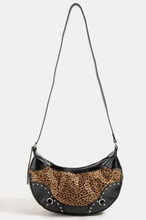 - This shoulder bag introduces a stunning dark spotted leopard print half moon style. Experience a burst of creativity in accessorizing as this piece effortlessly sets the tone for your unique style.