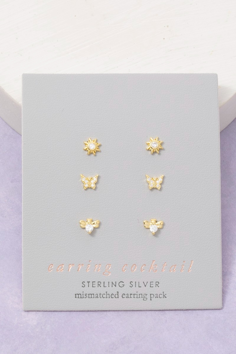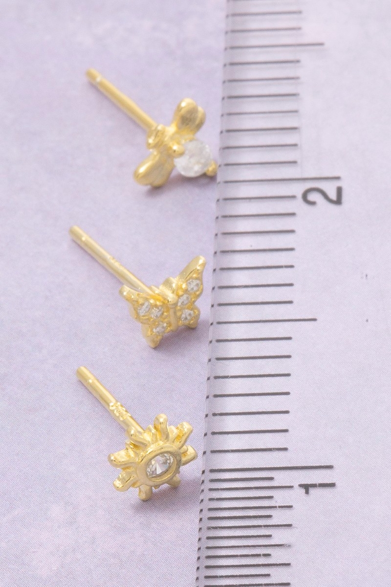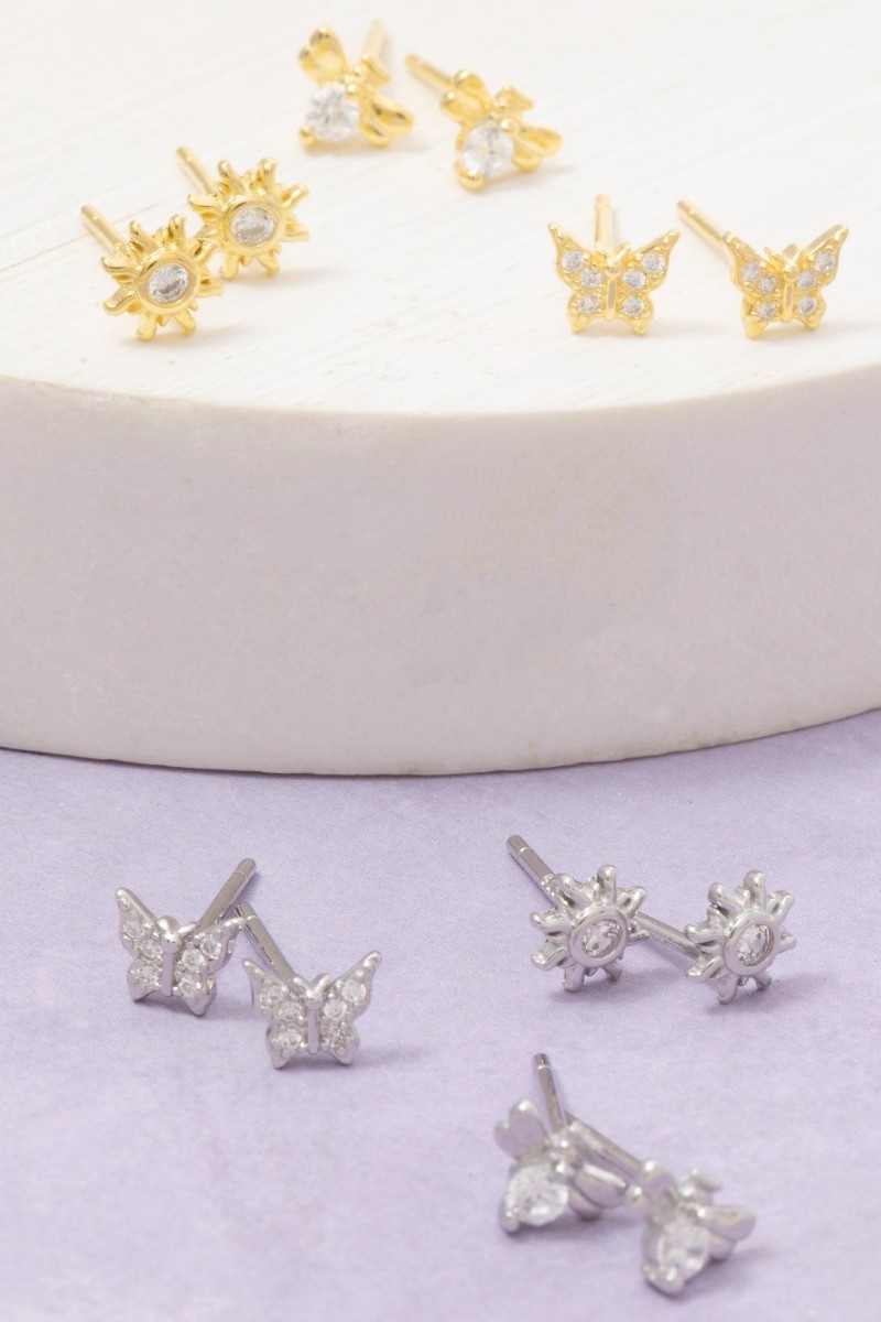 • This pair of stud earrings displays a fashionable sterling silver cubic zirconia butterfly sun and bee set style. Indulge in the artistry of accessorizing with this unique piece.