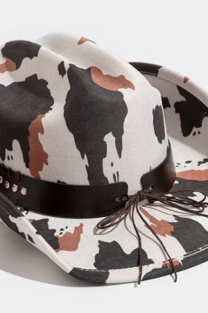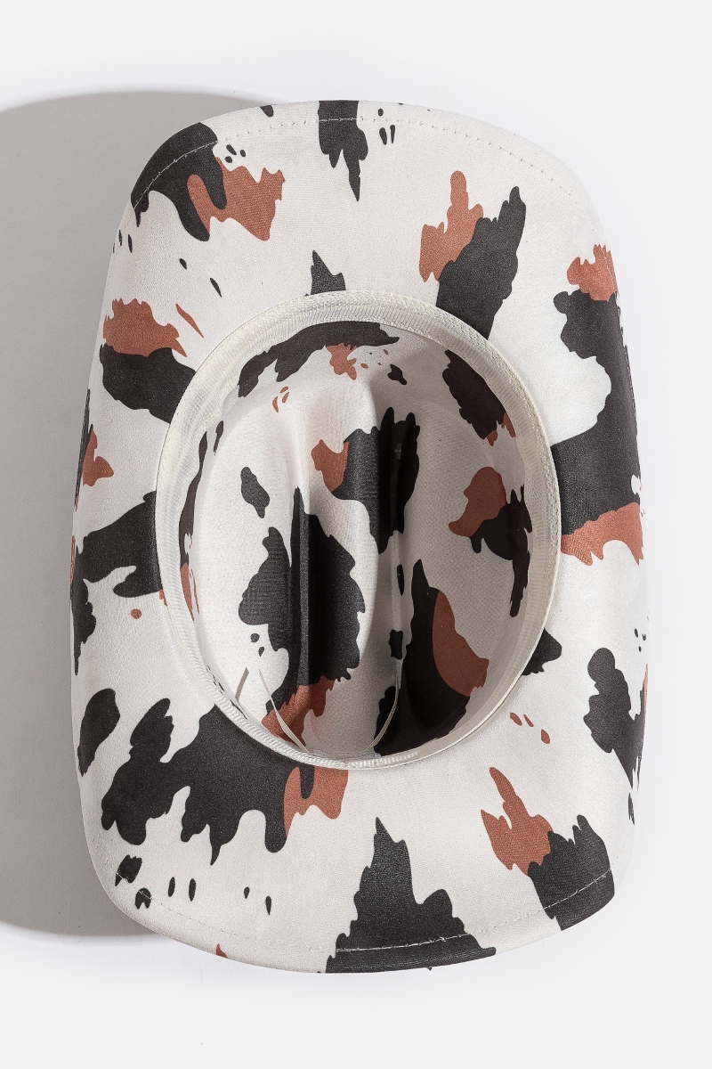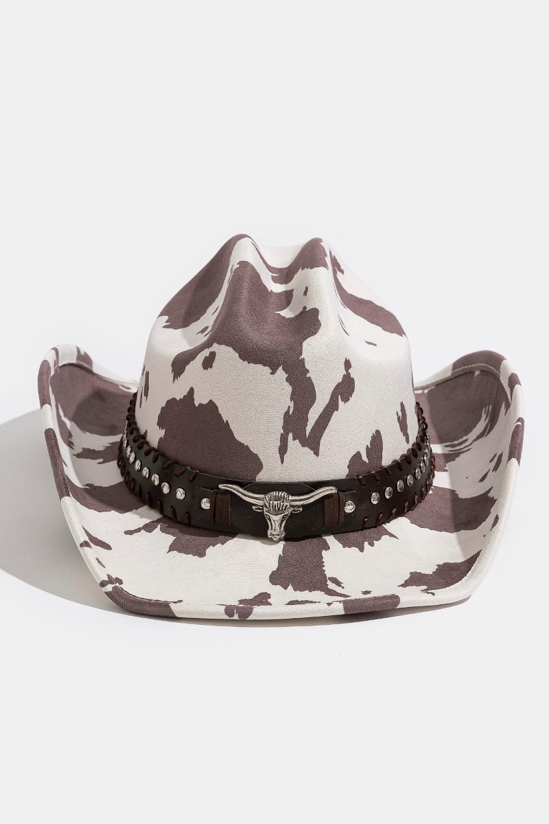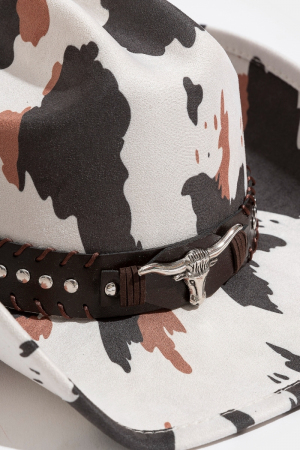 - This cowboy hat showcases a unique western bull head strap cow print style. Savor the craftsmanship that goes beyond the ordinary, as this cowboy hat effortlessly captivates attention.