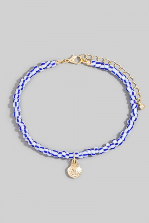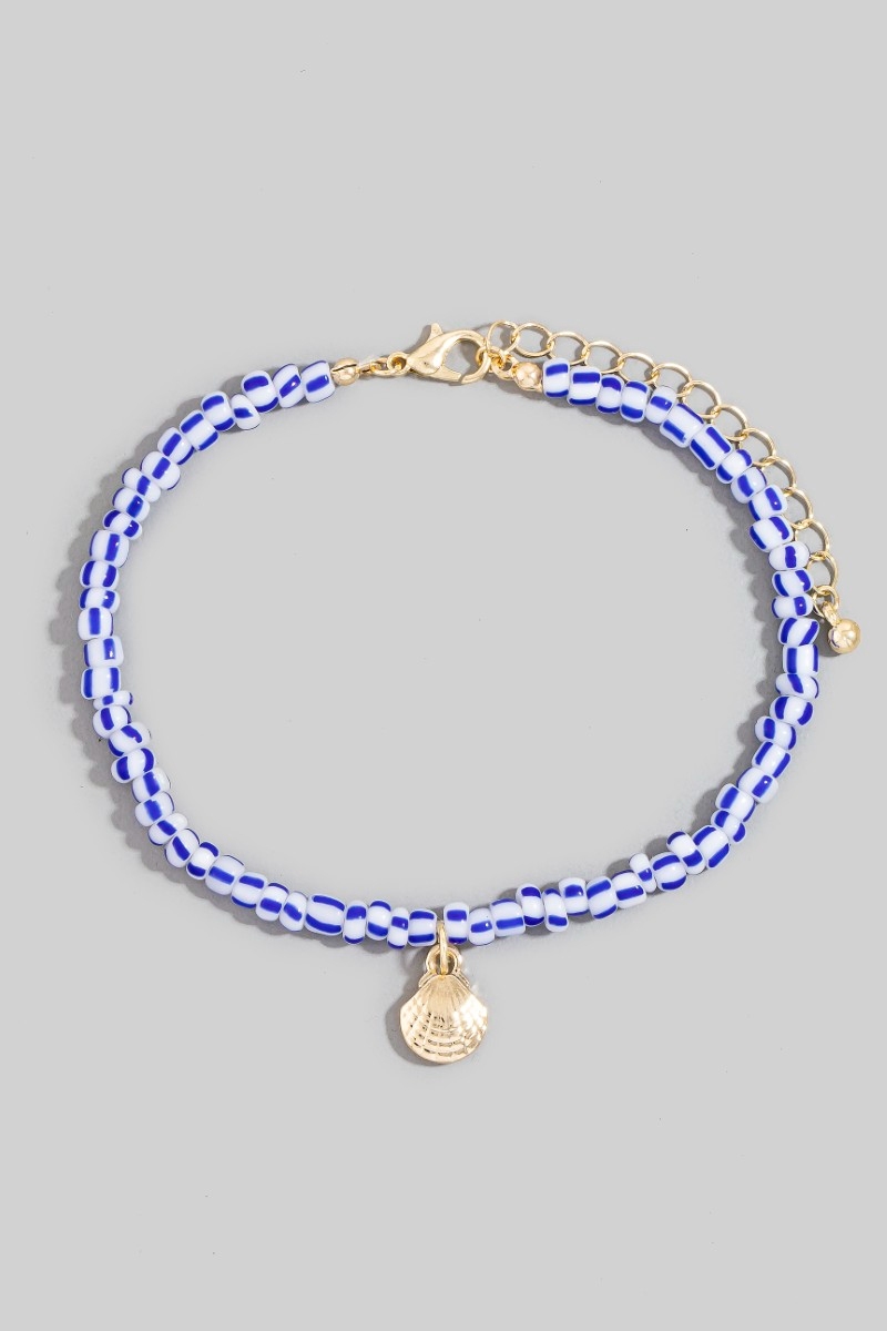 - This anklet showcases a timeless clam shell charm beaded style. Discover the perfect balance of subtlety and flair as this anklet effortlessly completes your look.