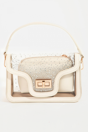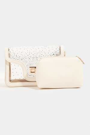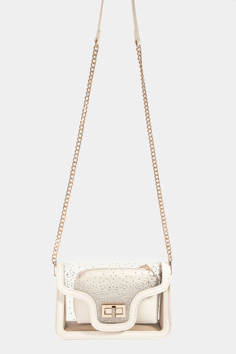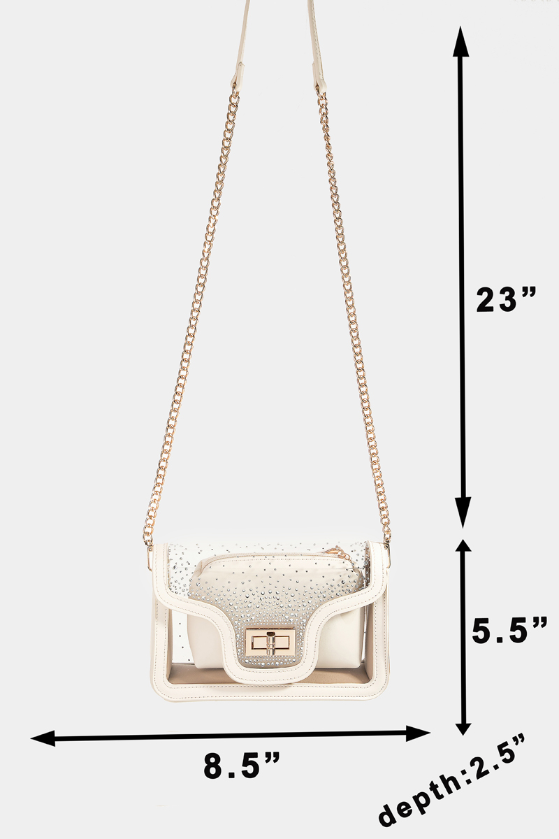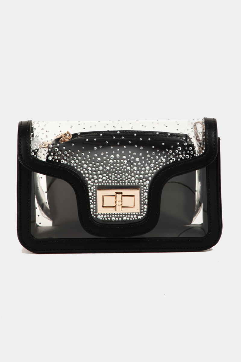 • This crossbody bag displays a vibrant transparent rectangle studded style. Delight in the nuanced details that make this accessory a testament to fine design and impeccable taste.