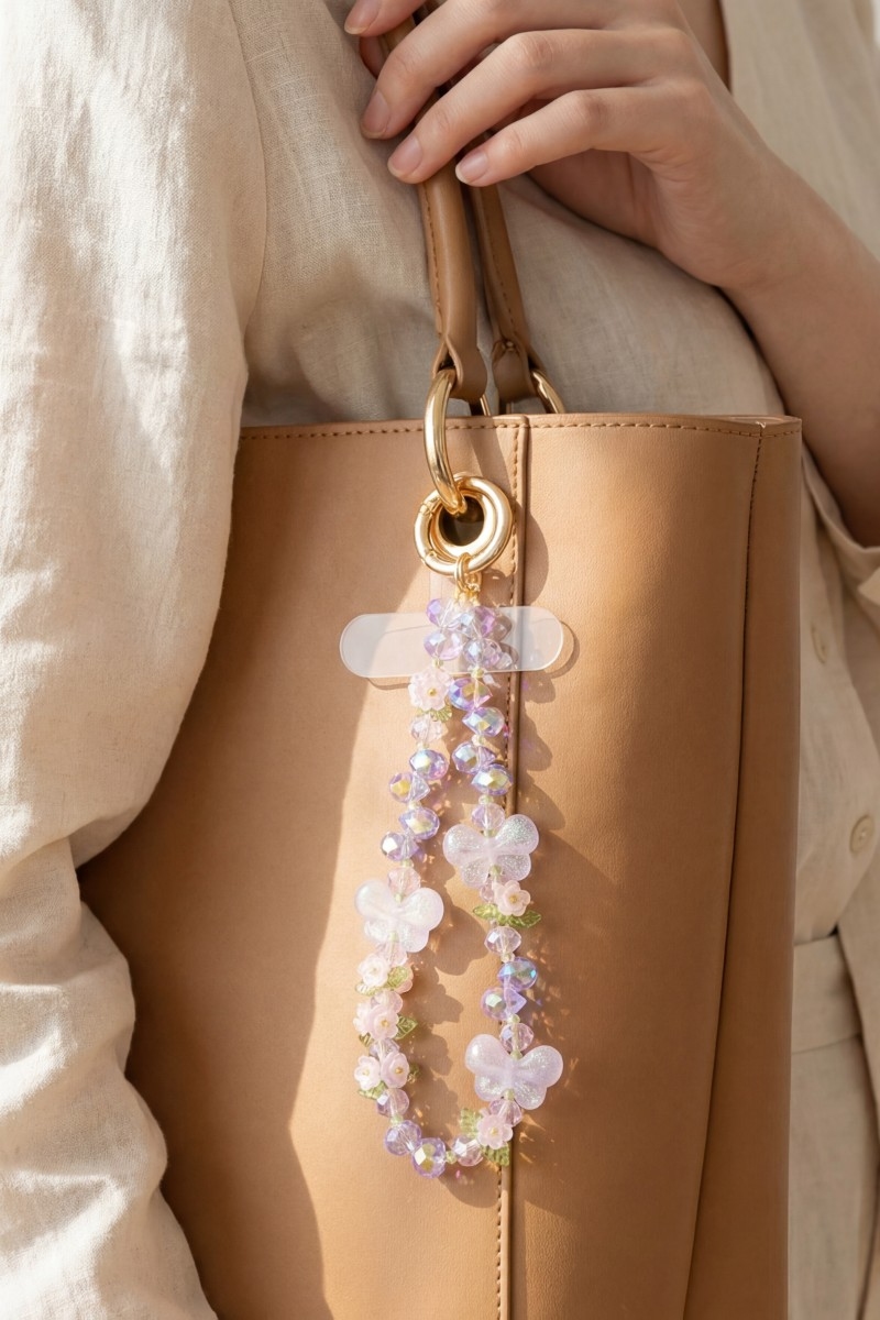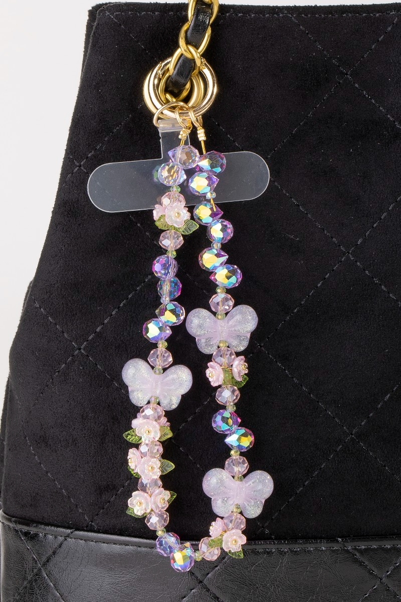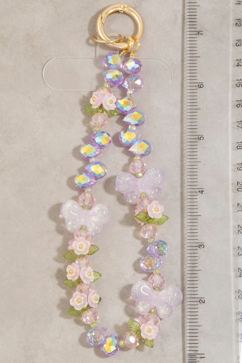 - This bag charm displays a vibrant assorted flower butterfly beads style. Experience a subtle blend of modernity and classic charm as this bag charm effortlessly adorns your ensemble.