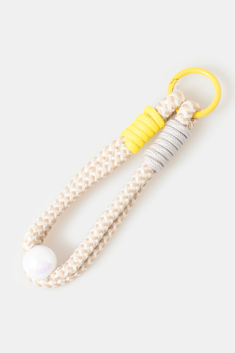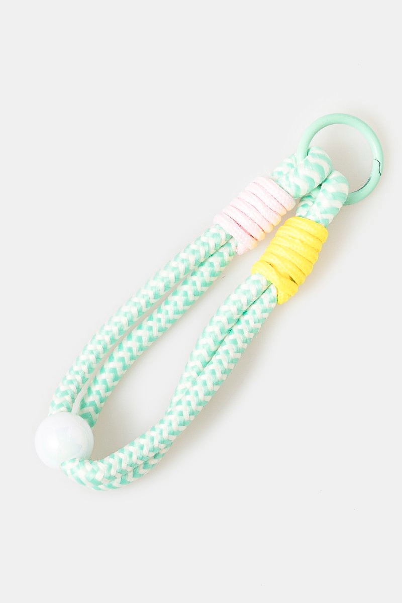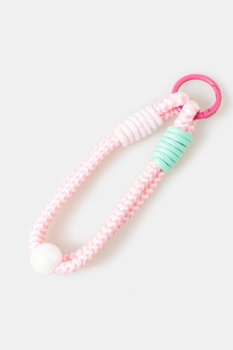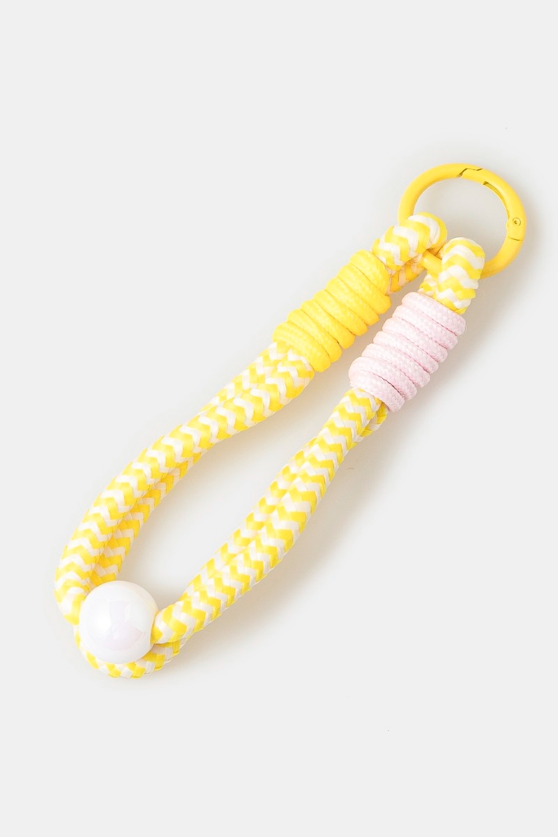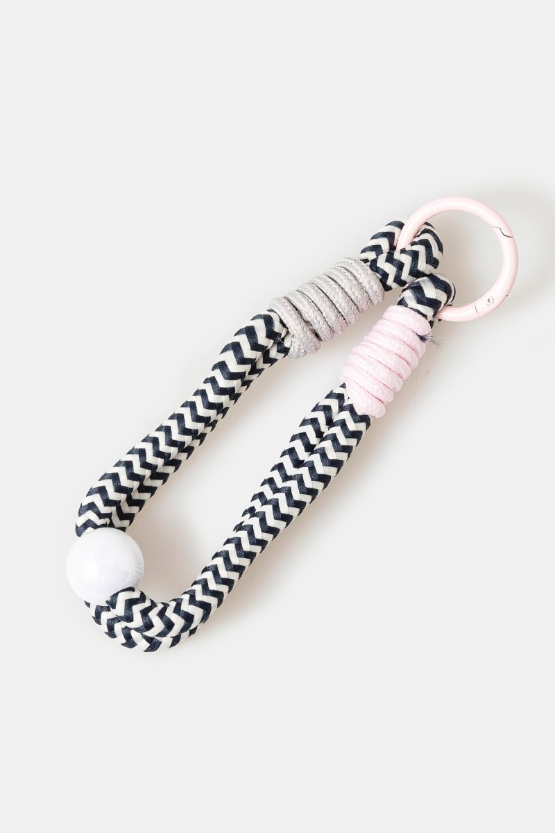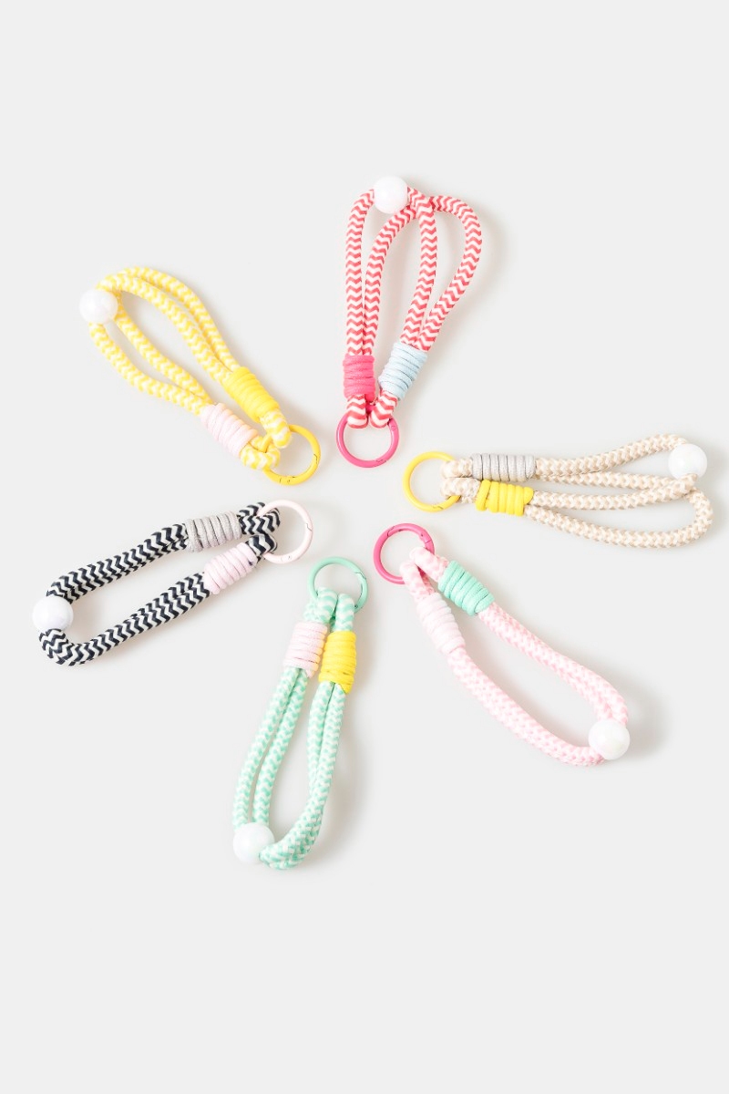 - This bag charm features a fashionable chevron pattern bungee corda and bead style. Experience a subtle blend of modernity and classic charm as this bag charm effortlessly adorns your ensemble.