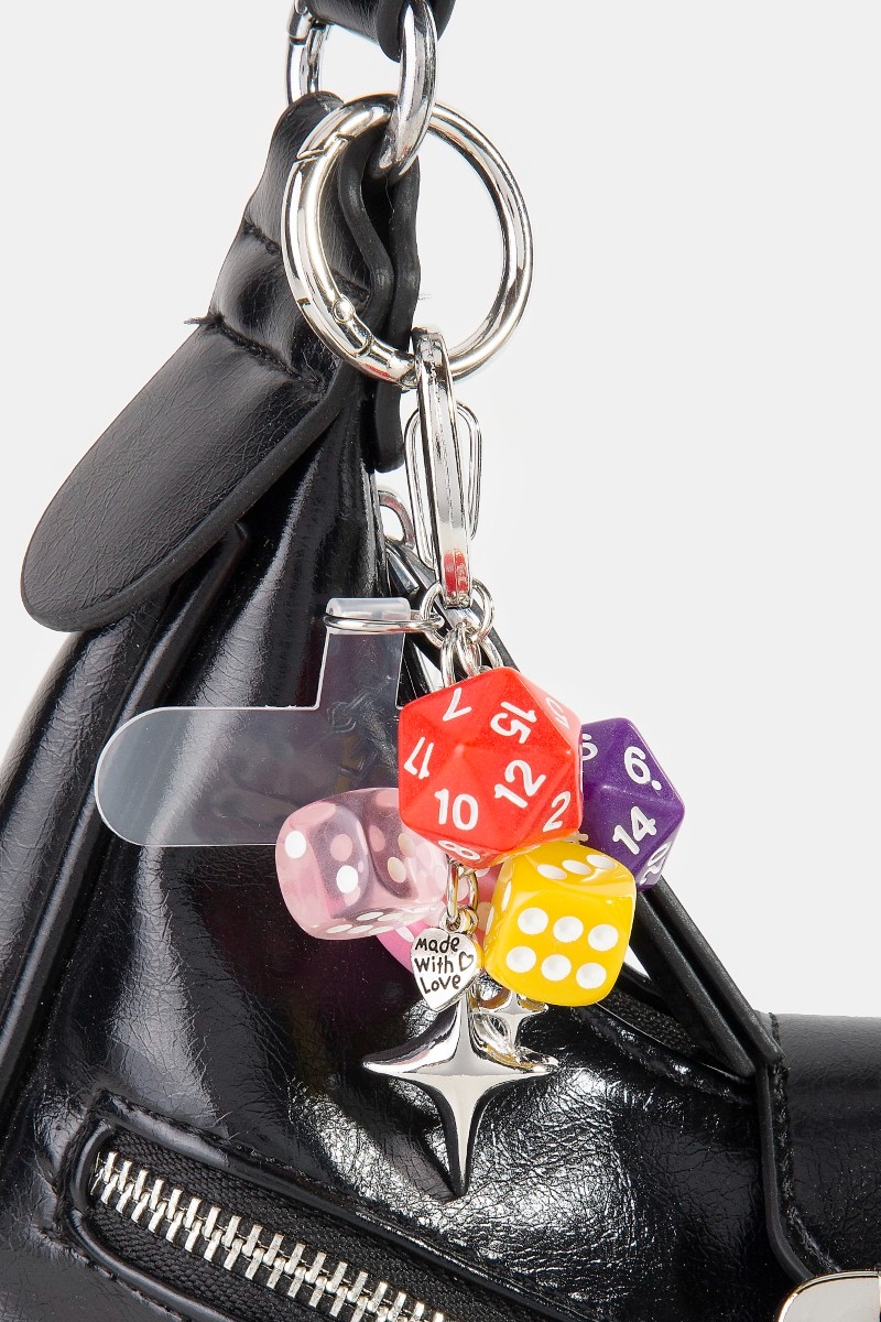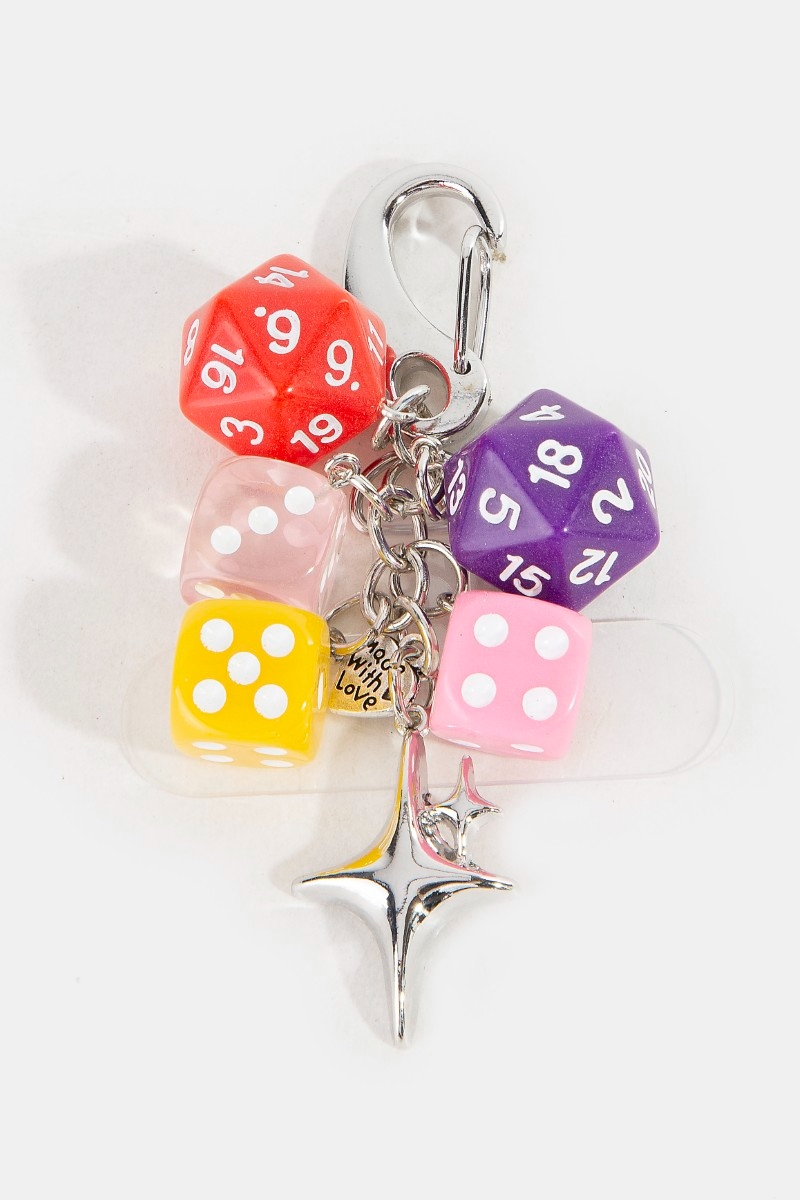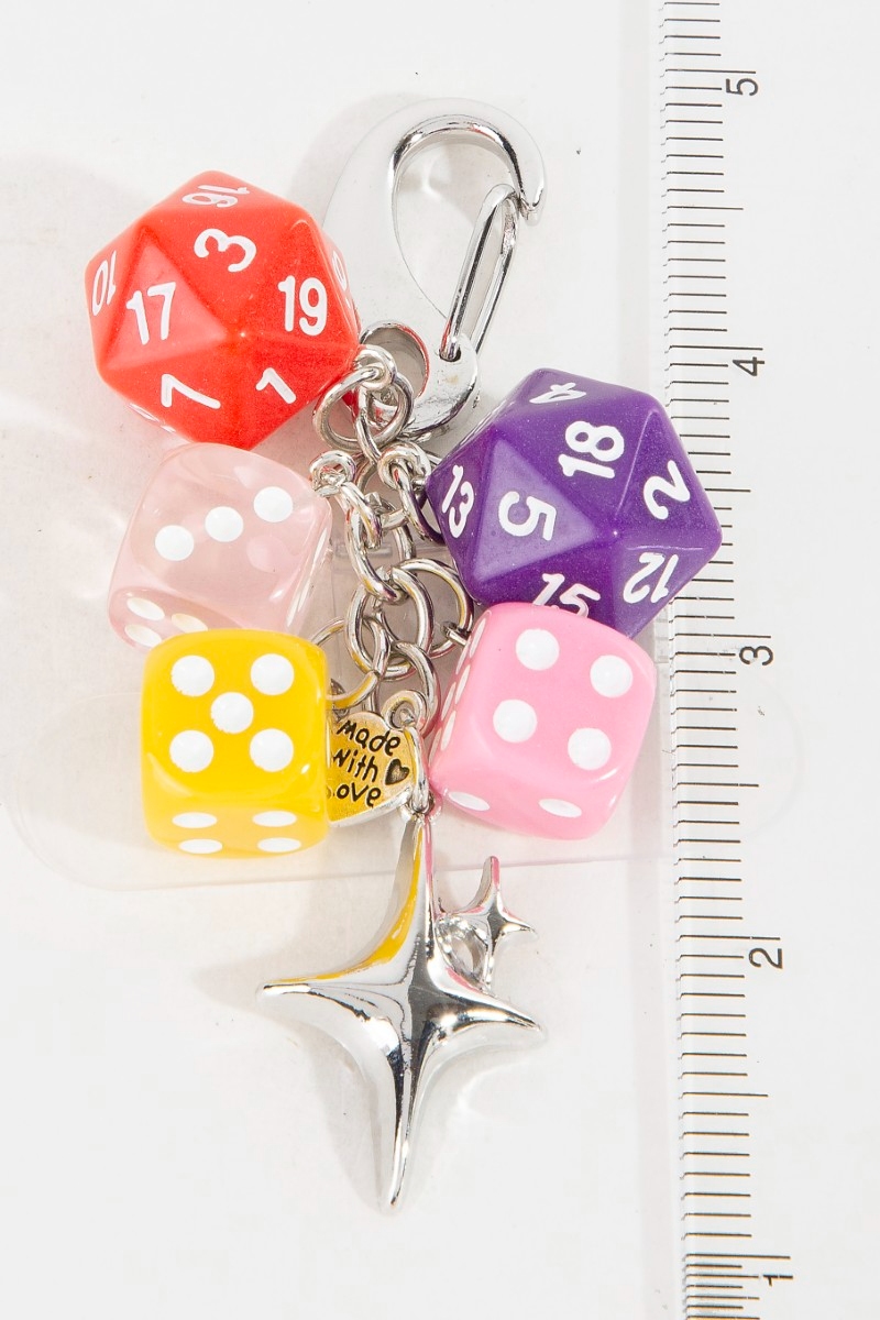 - This bag charm displays a vibrant dice and star chain style. Indulge in the artistry of accessorizing with this unique piece.