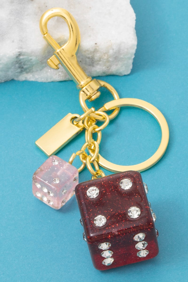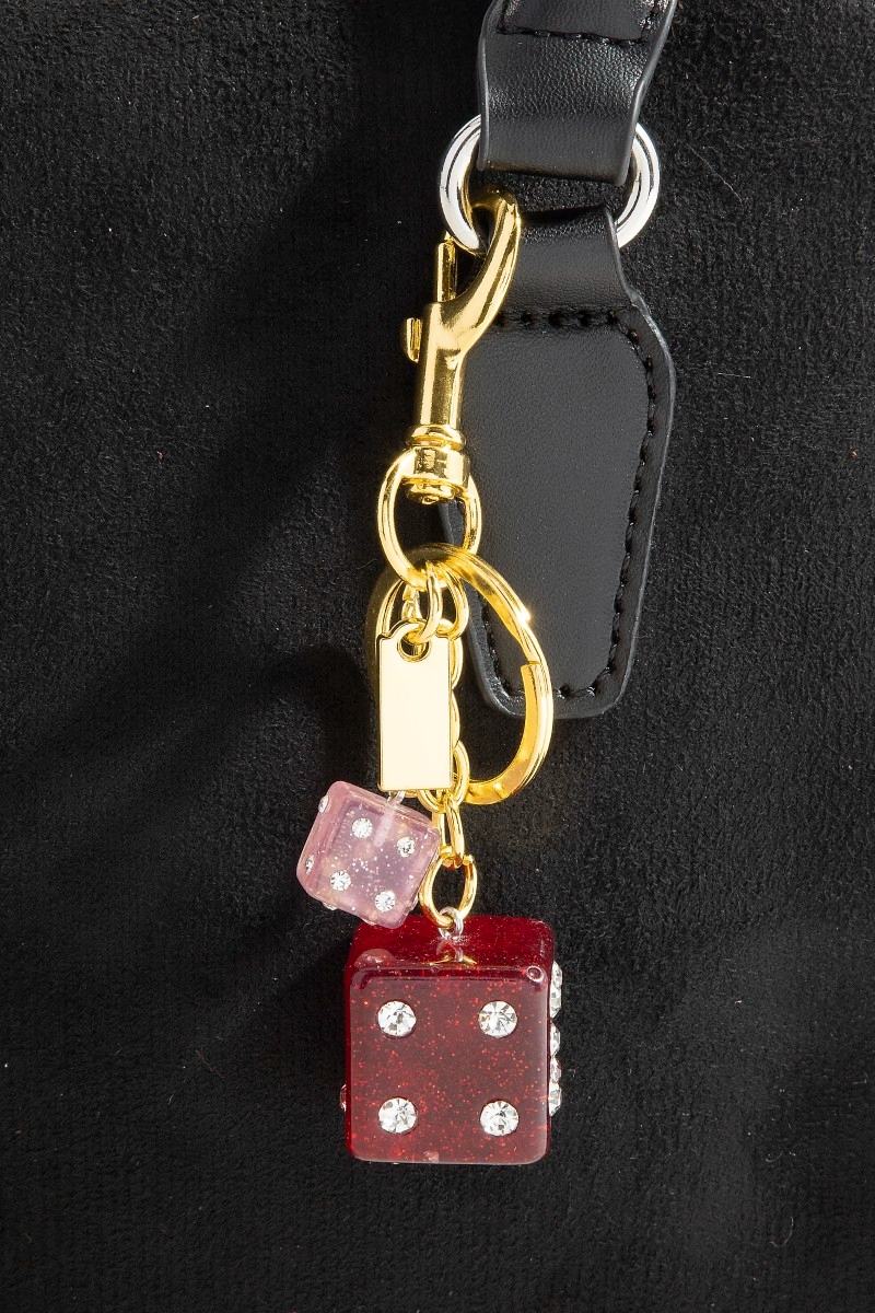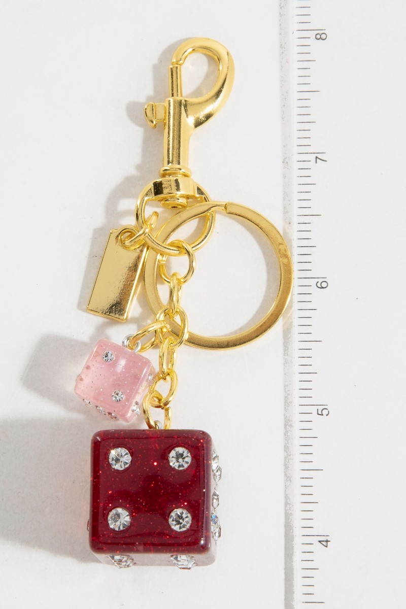 - This bag charm adds a modern glittery rhinestone dice s style. Step into a world of refined taste as this bag charm effortlessly refines the details of your outfit.