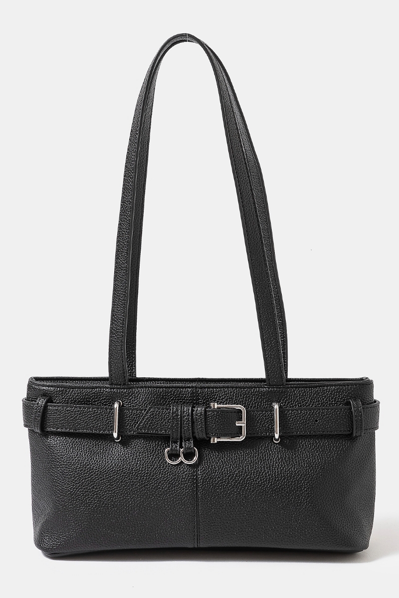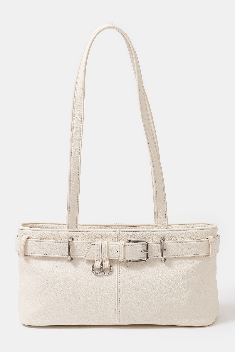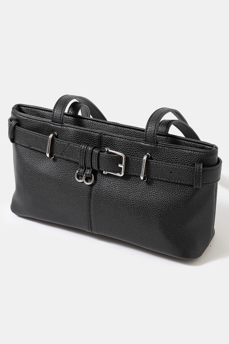 - This hand bag introduces a unique belt strap textured faux leather style. Redefine your look effortlessly with this standout, on-trend piece.