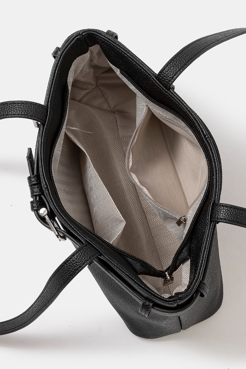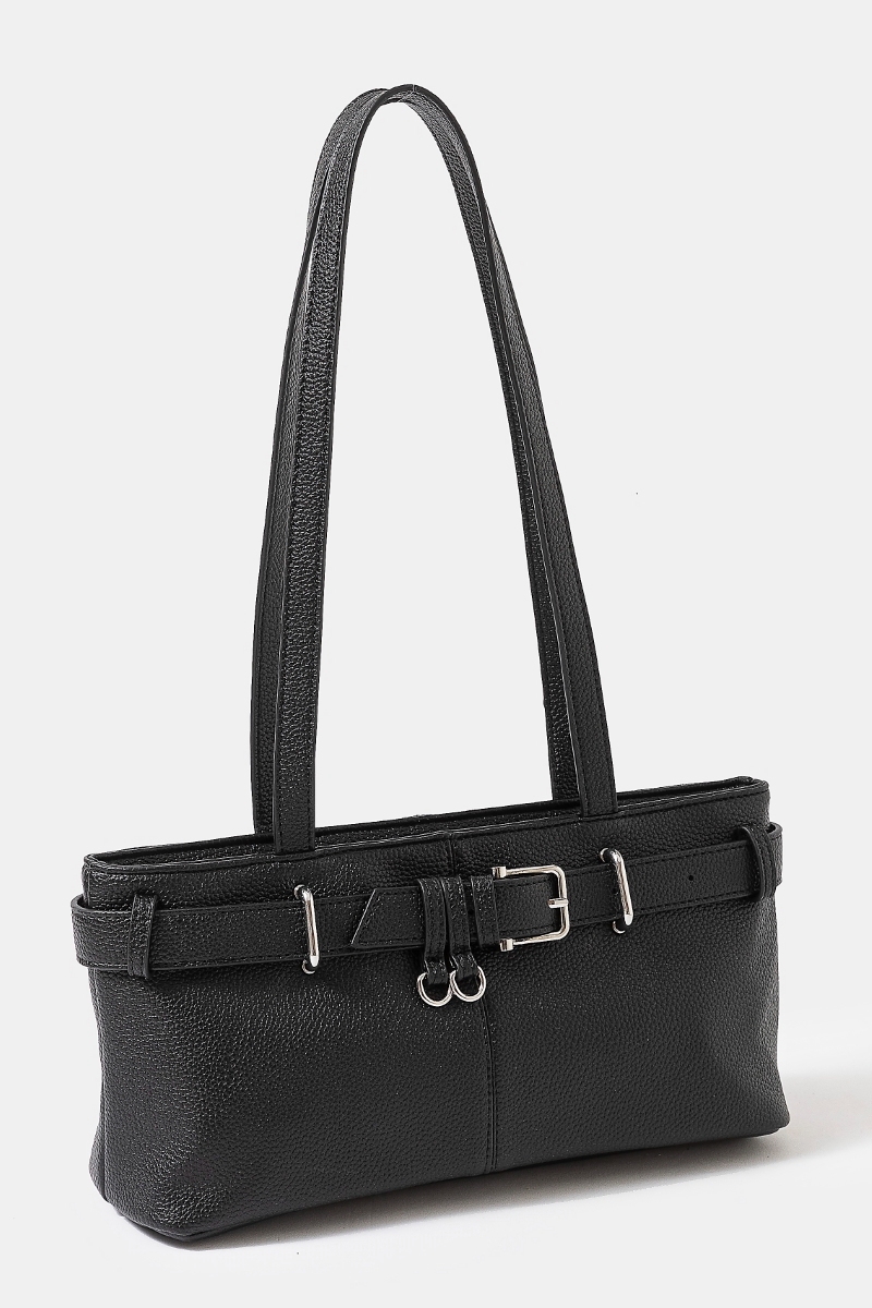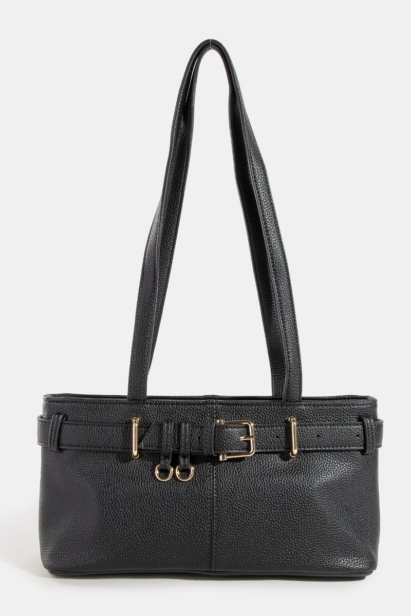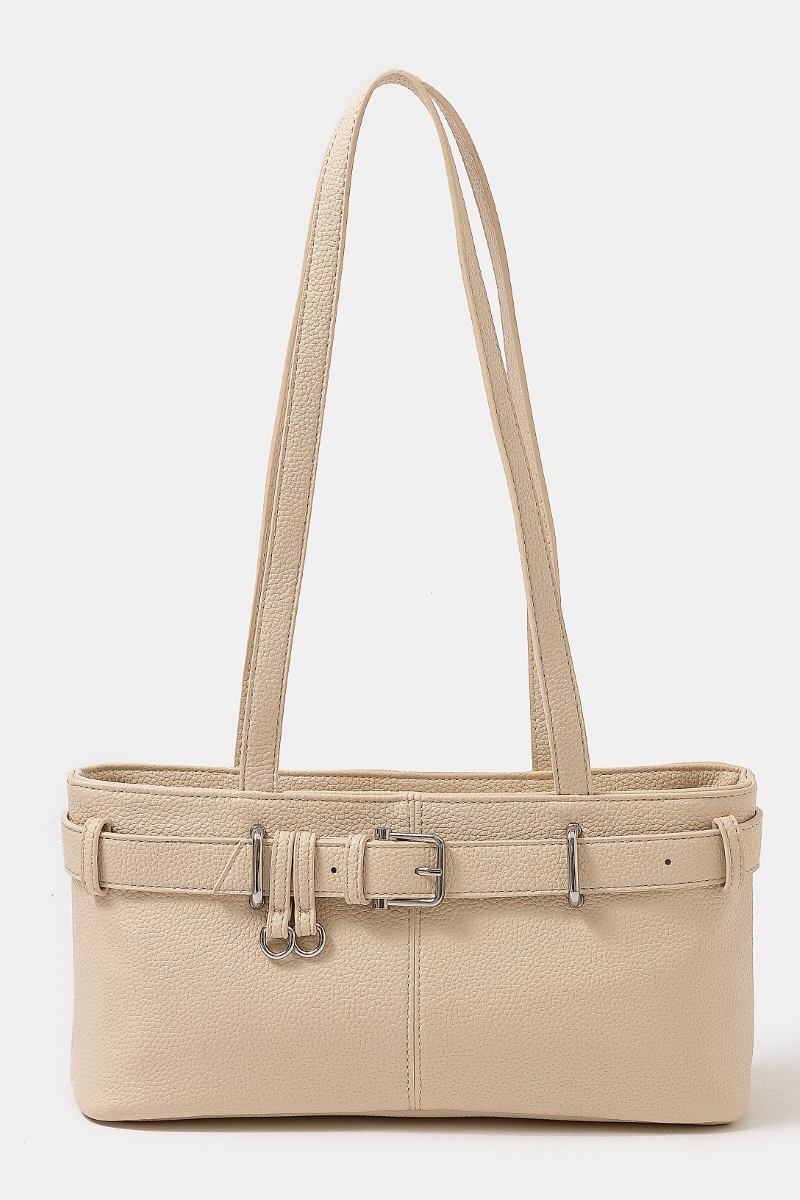 - This hand bag introduces a unique belt strap textured faux leather style. Redefine your look effortlessly with this standout, on-trend piece.