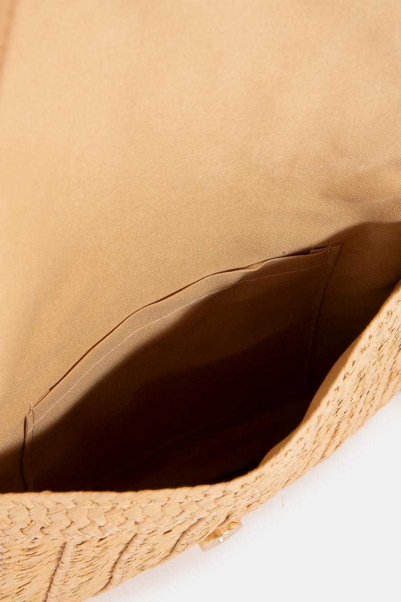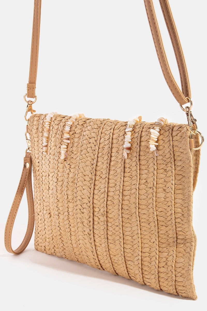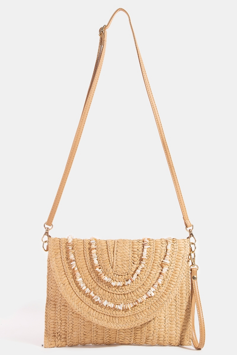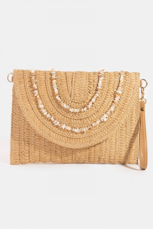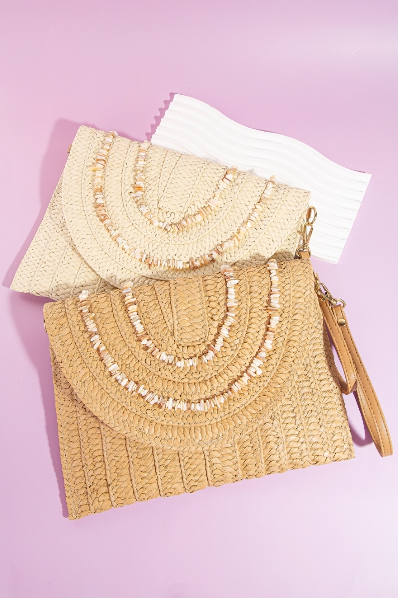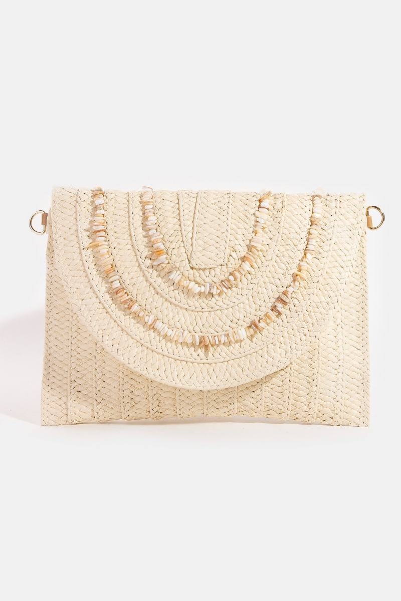 - This clutch bag displays a fashionable shell beaded accent paper woven envelope style. Experience a subtle blend of modernity and classic charm as this clutch bag effortlessly adorns your ensemble.