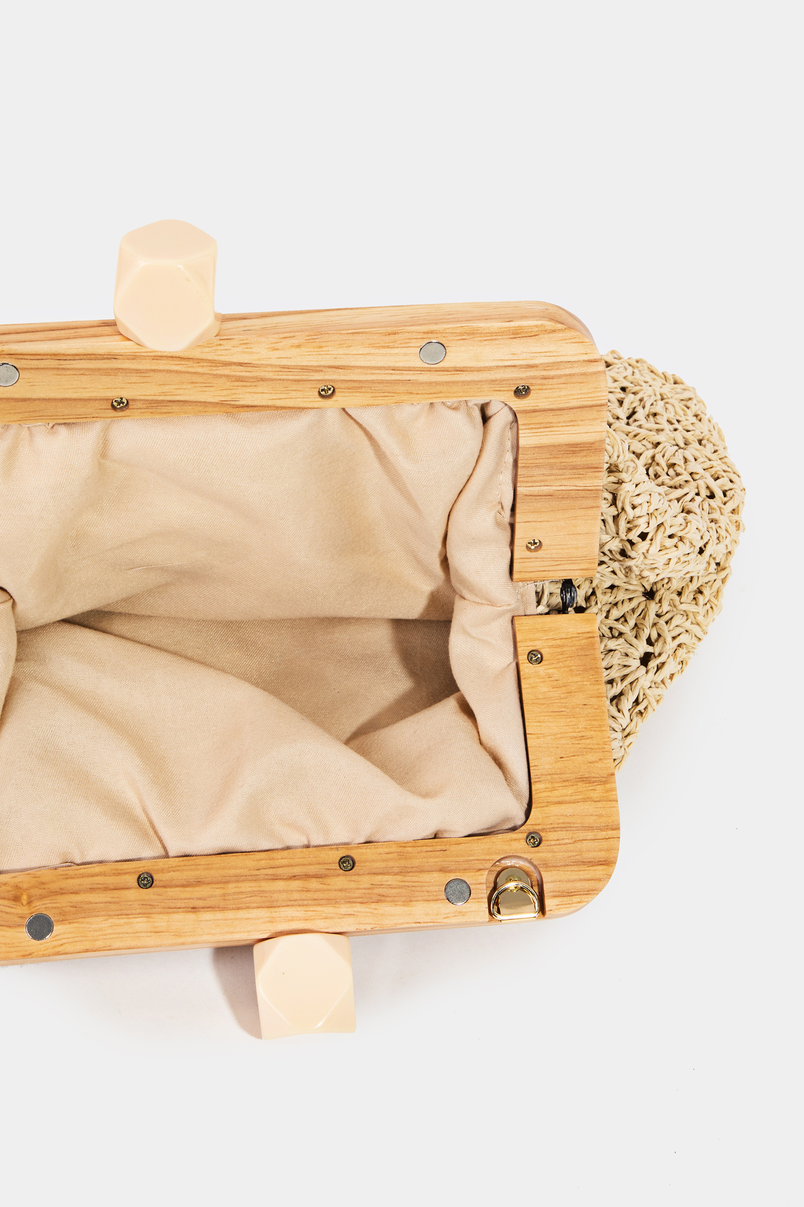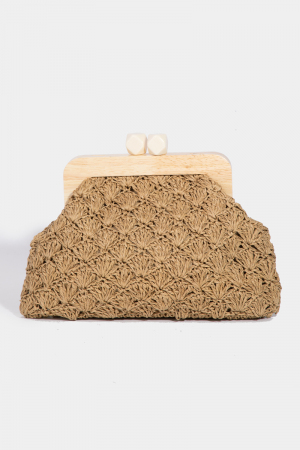 - This bag introduces a stunning straw braided wooden frame clutch style. Unveil modern elegance with this subtly intricate bag.