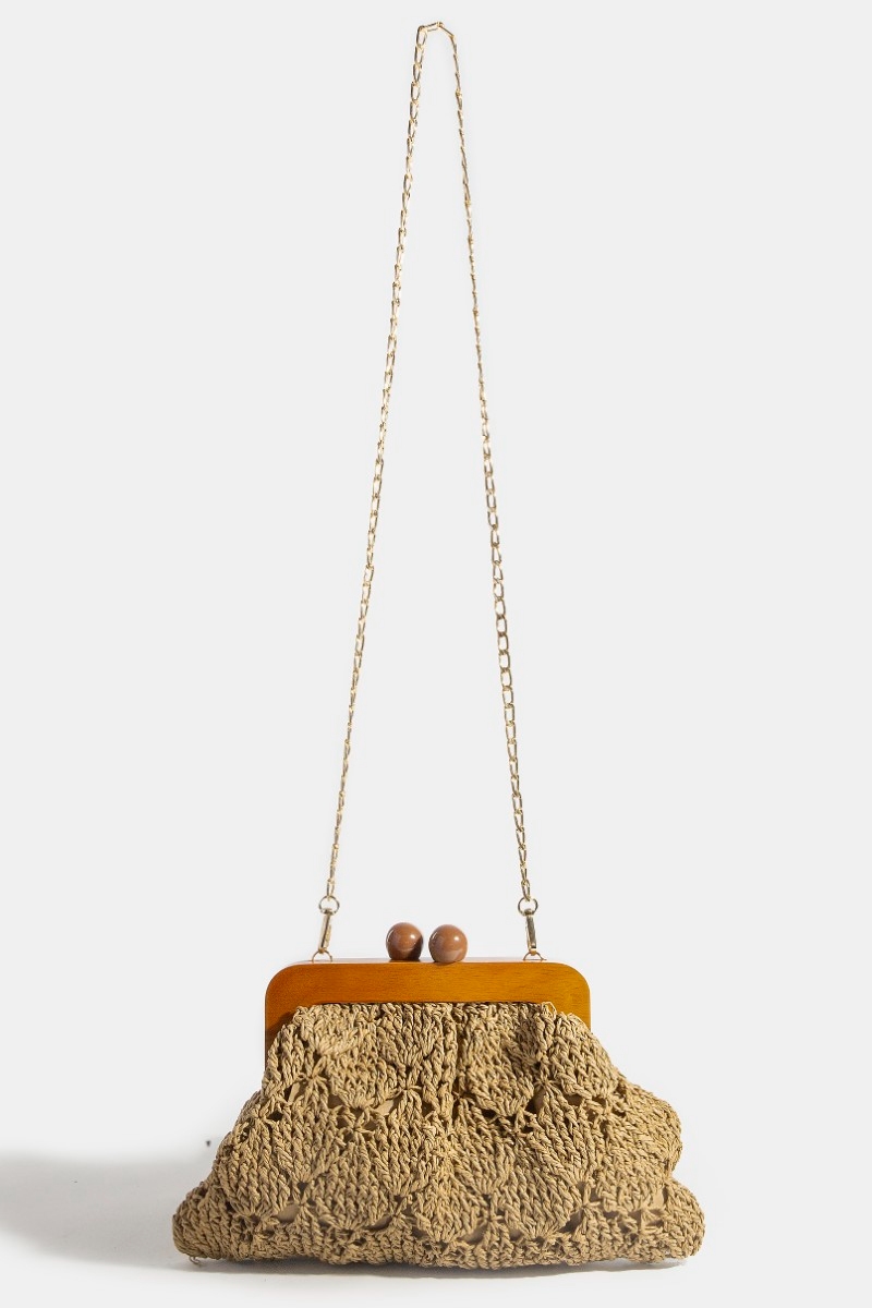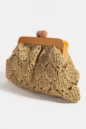 • This clutch bag displays a fashionable straw braided wooden frame style. Immerse yourself in fashion finesse with this statement clutch bag.