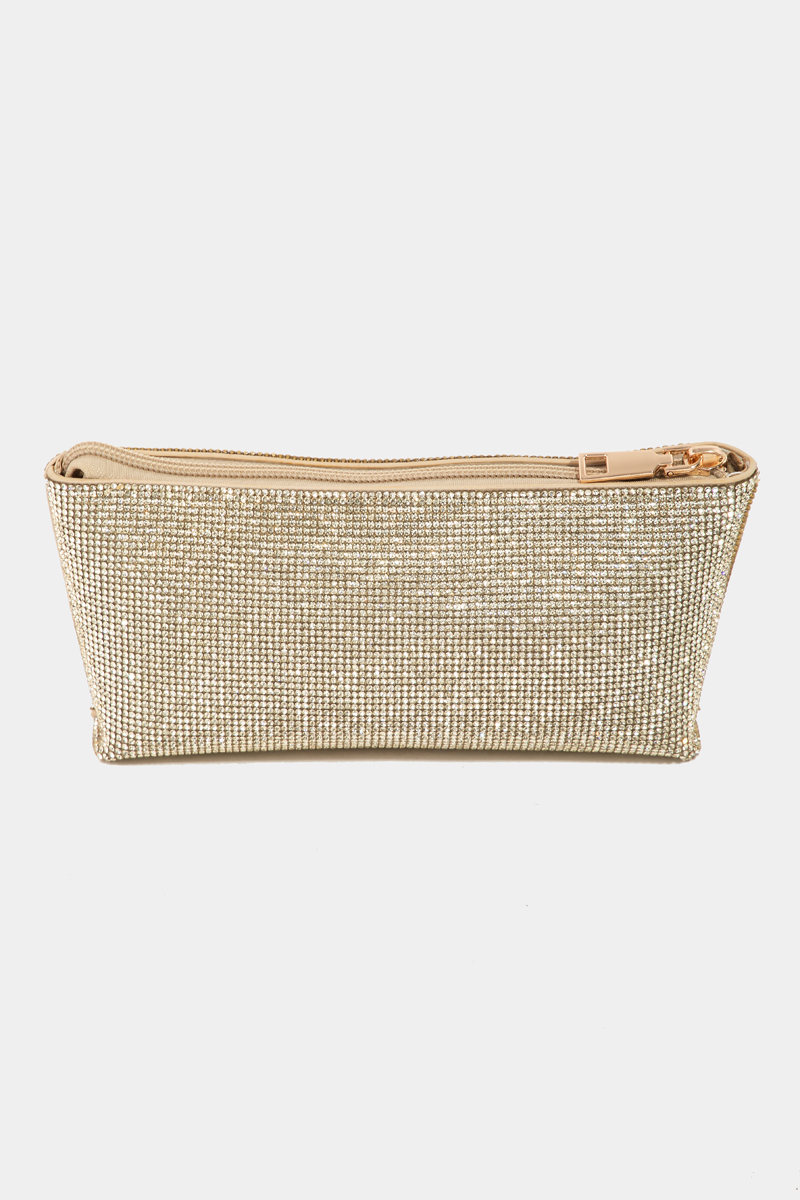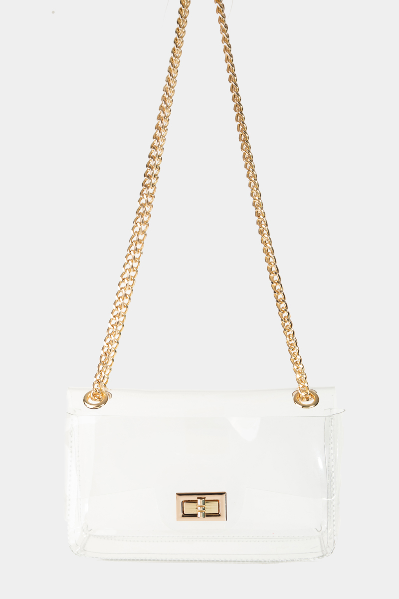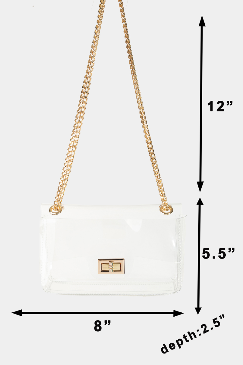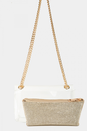 • This clutch bag introduces a unique turn lock chain strap style. It also includes comes with a pave studded clutch bag. Redefine your look effortlessly with this standout, on-trend piece.