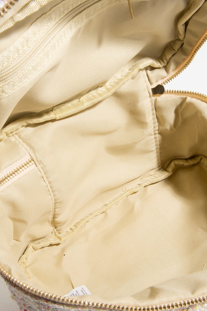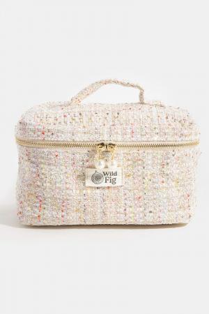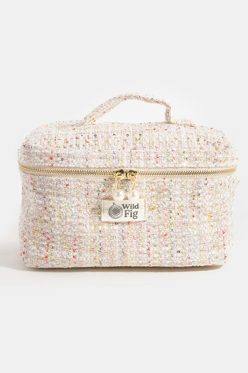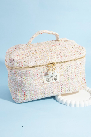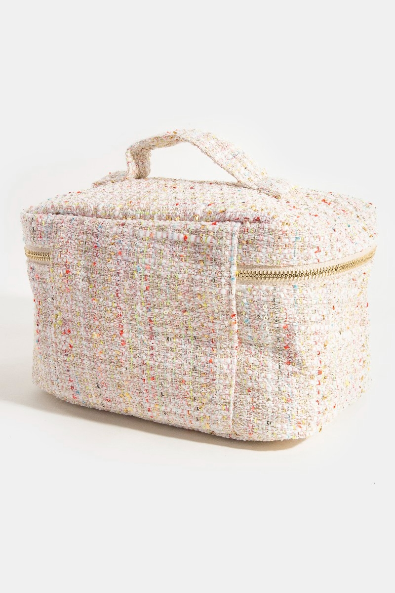 - This bag introduces a stunning confetti tweed makeup case cosmetic style. Experience a subtle blend of modernity and classic charm as this bag effortlessly adorns your ensemble.