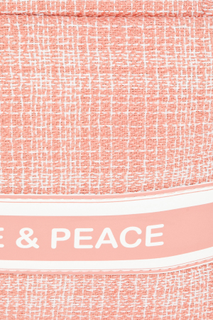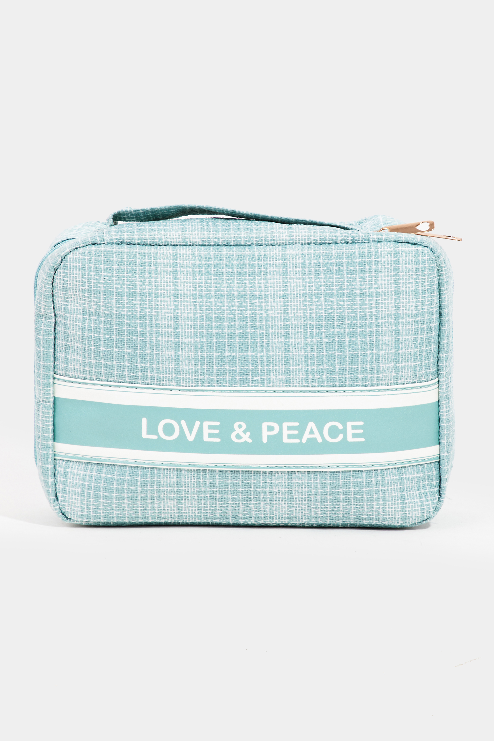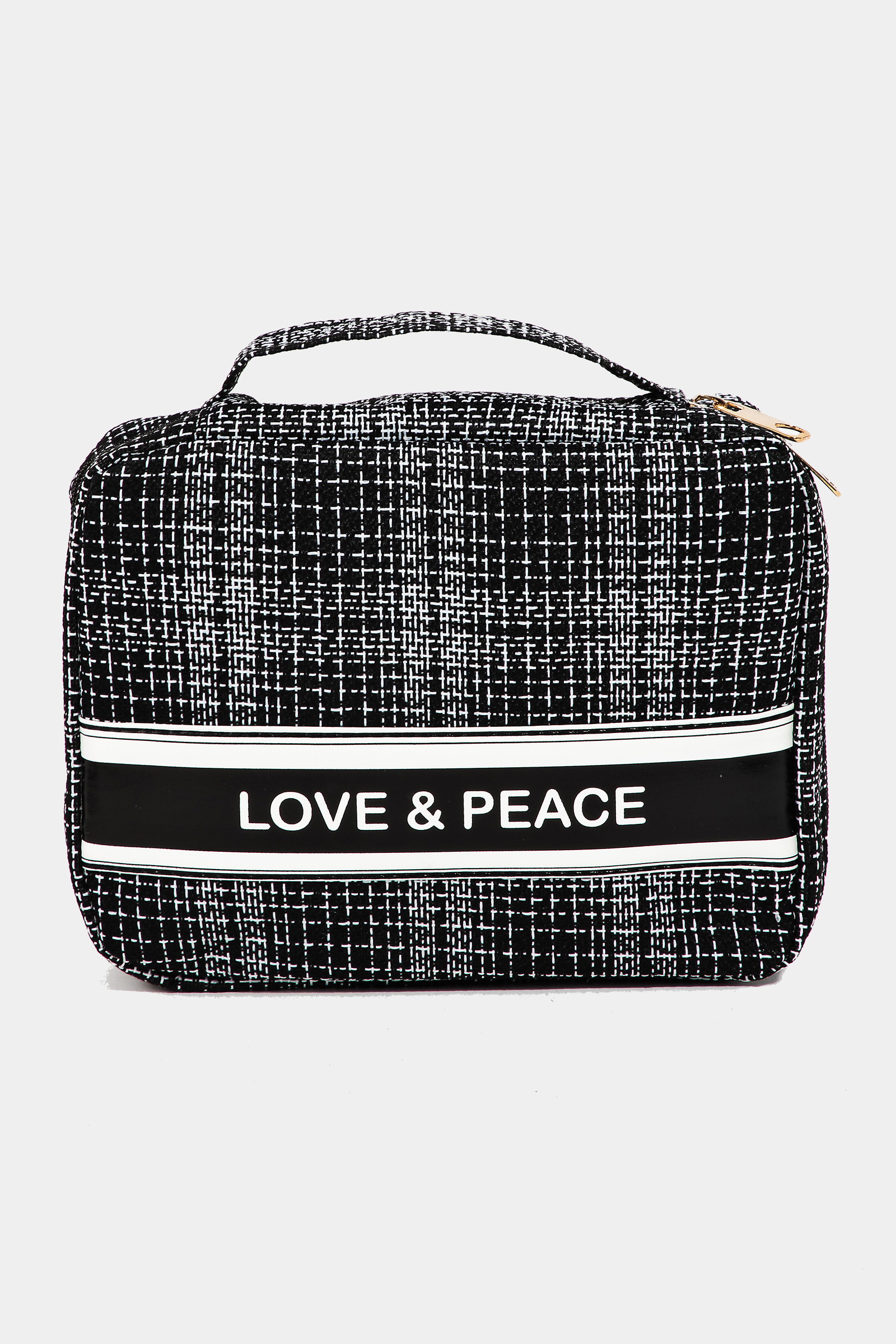 • This hand bag displays a fashionable love and peace striped cosmetic bag style. Unveil modern elegance with this subtly intricate accessory.