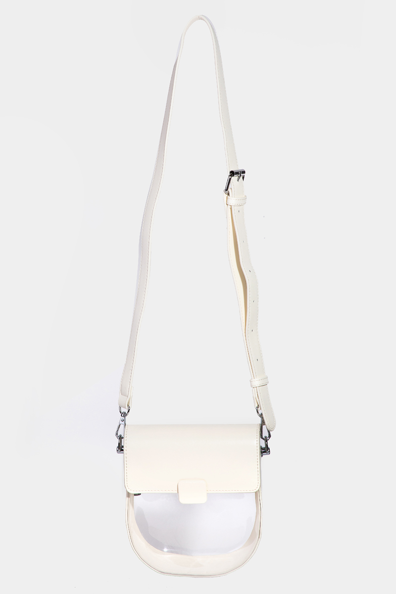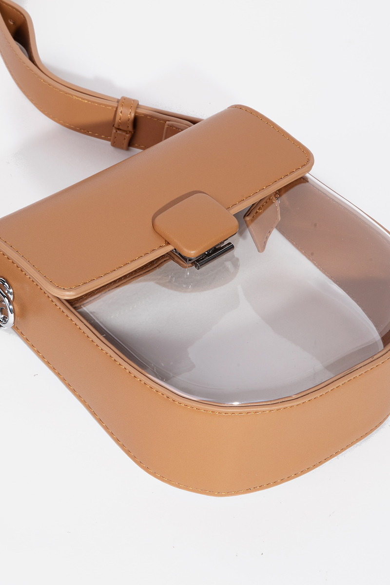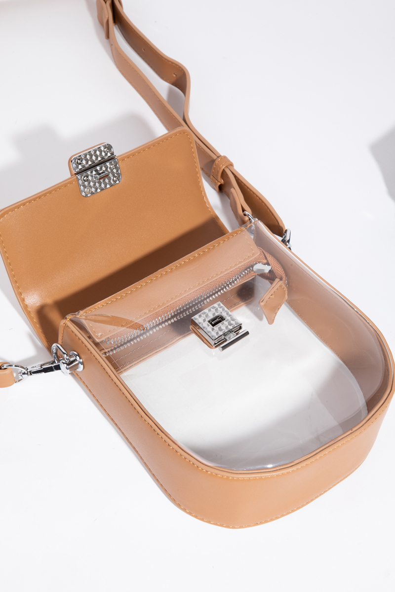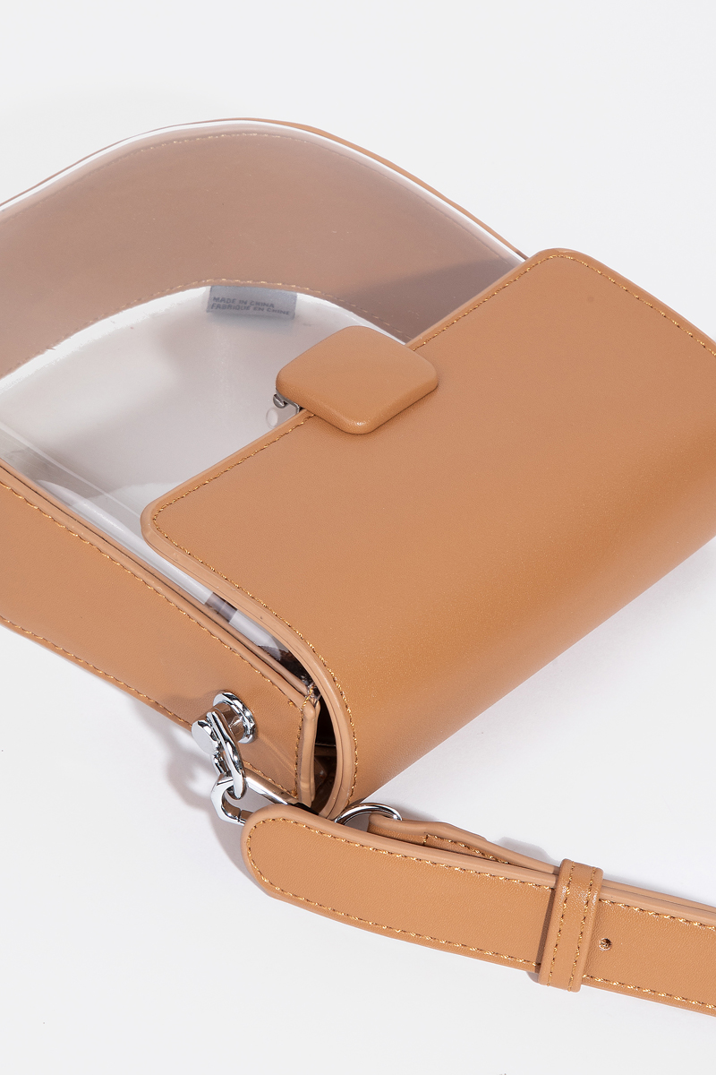 • This crossbody bag adds a modern faux leather clear see through style. Discover the perfect balance of functionality and fashion.