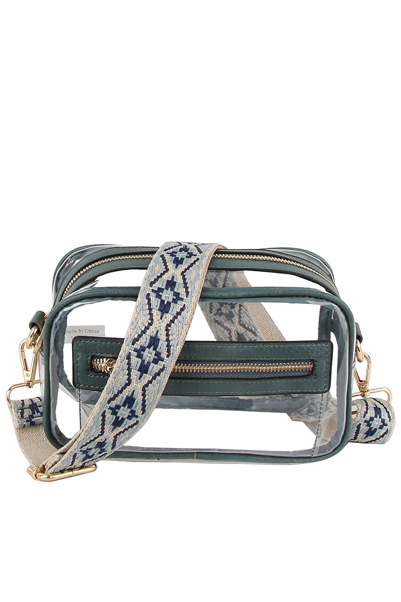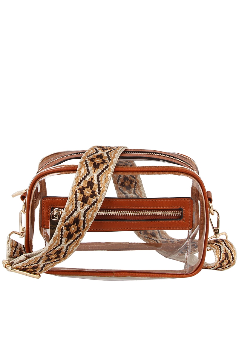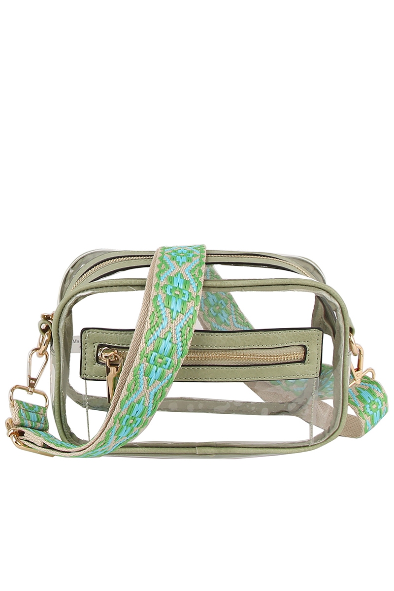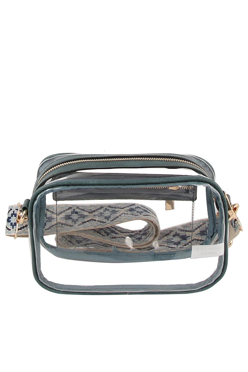 • This crossbody bag introduces a stunning see thru boxy guitar strap style. Celebrate individuality with this crossbody bag that effortlessly expresses your unique sense of style.