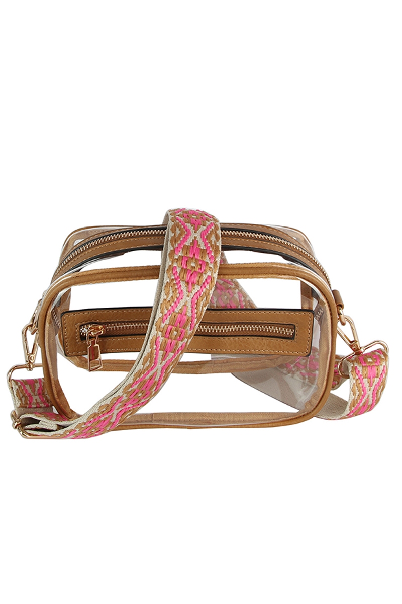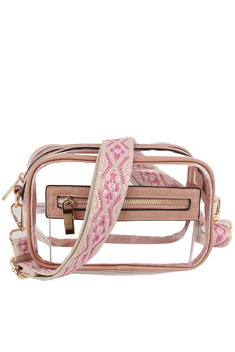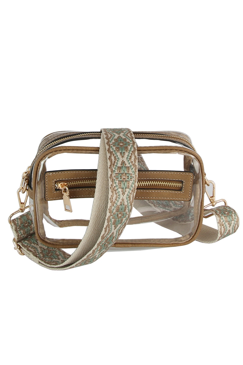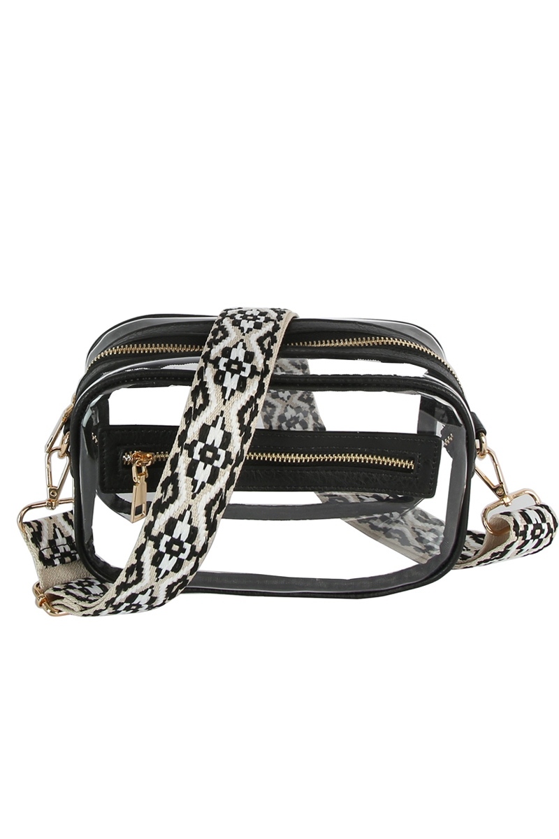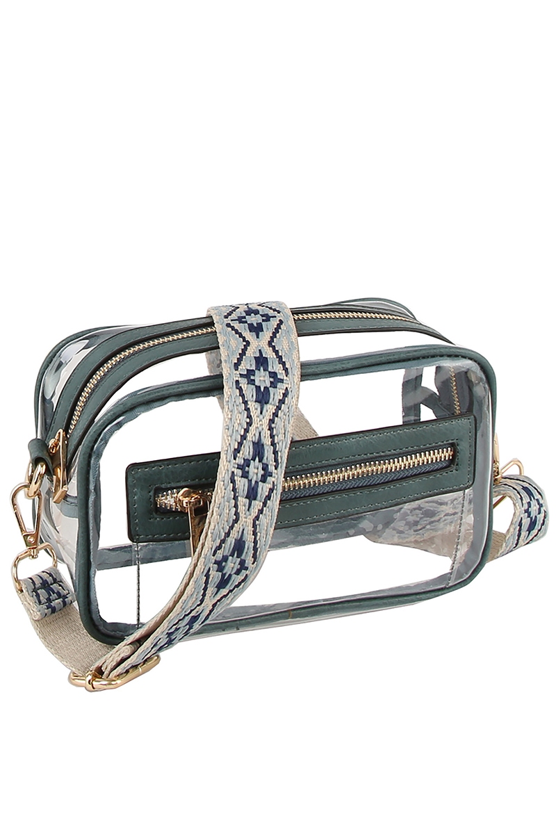 • This crossbody bag introduces a stunning see thru boxy guitar strap style. Celebrate individuality with this crossbody bag that effortlessly expresses your unique sense of style.