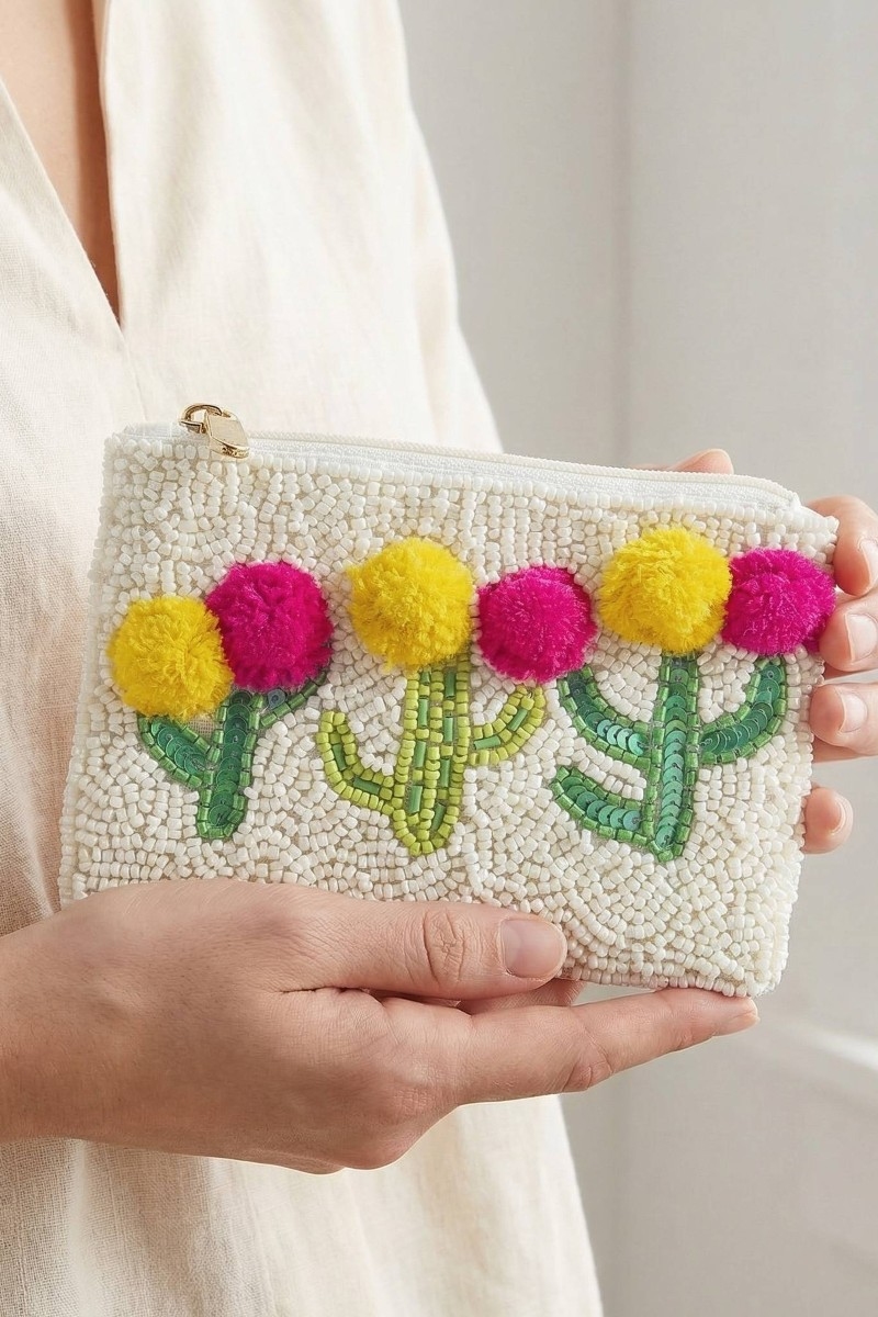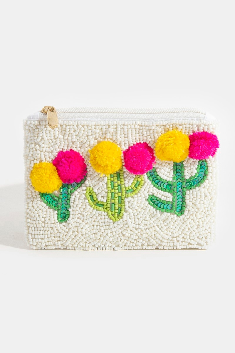 - This coin purse introduces a unique fuzzy cactus flowers seed beaded style. Immerse yourself in the world of understated glamour as this coin purse effortlessly exudes timeless appeal.