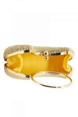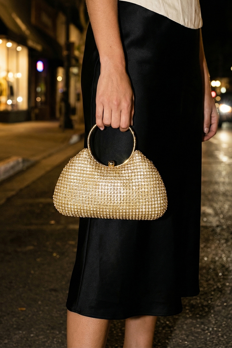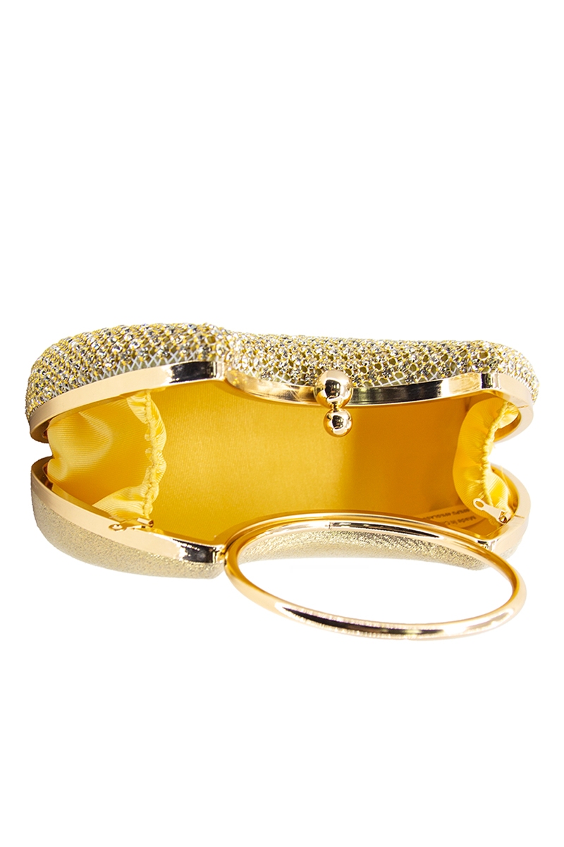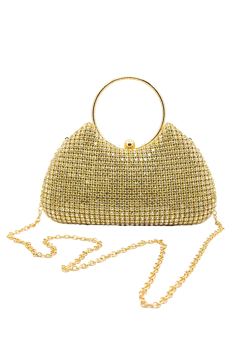 - This clutch bag introduces a stunning golden rhinestone mesh and hoop handle style. Experience refined sophistication with this understated yet stylish piece.