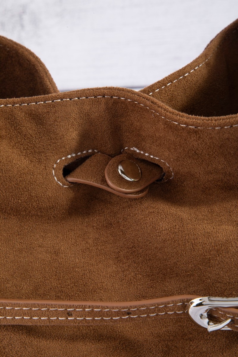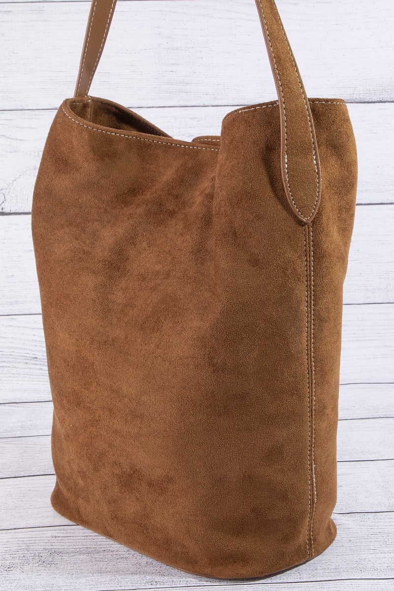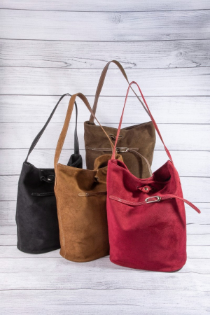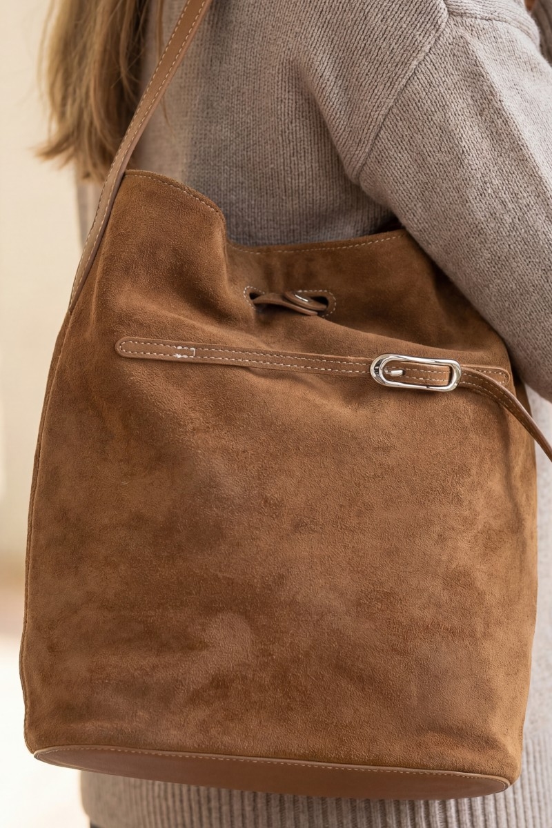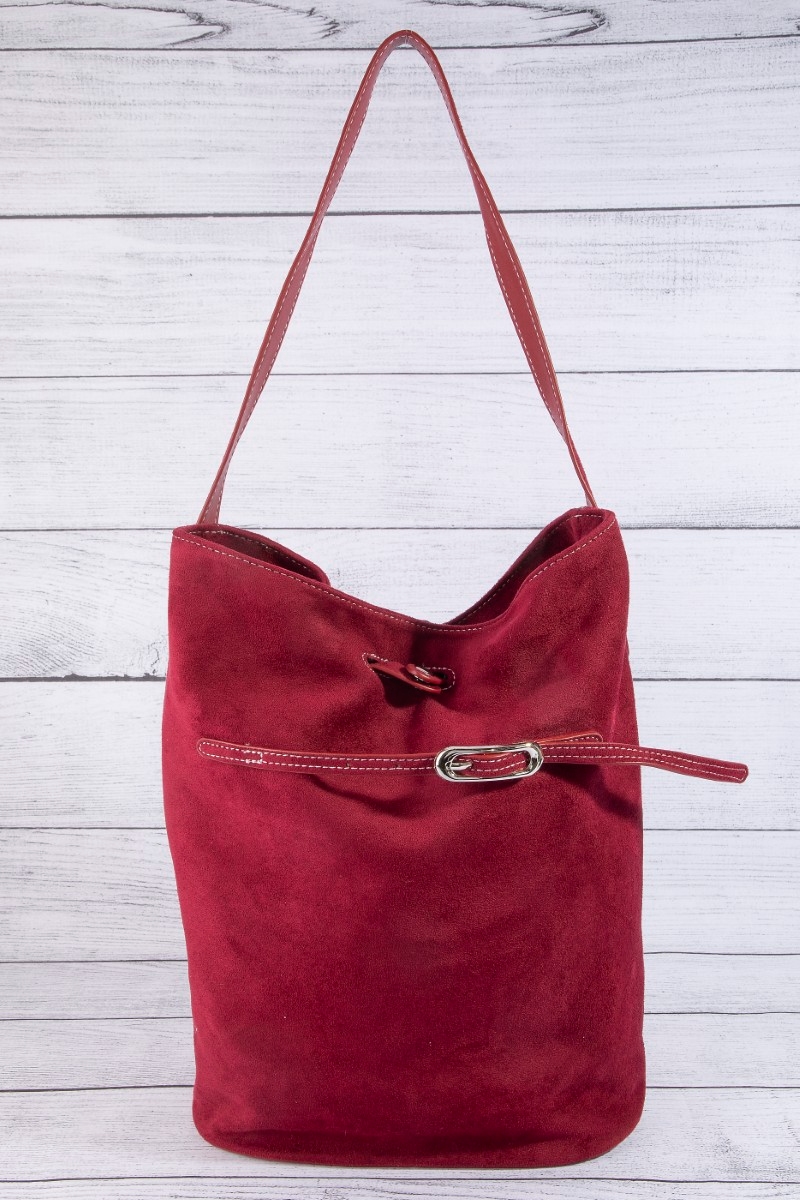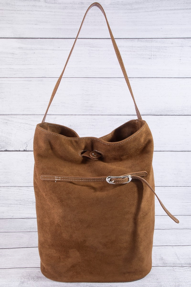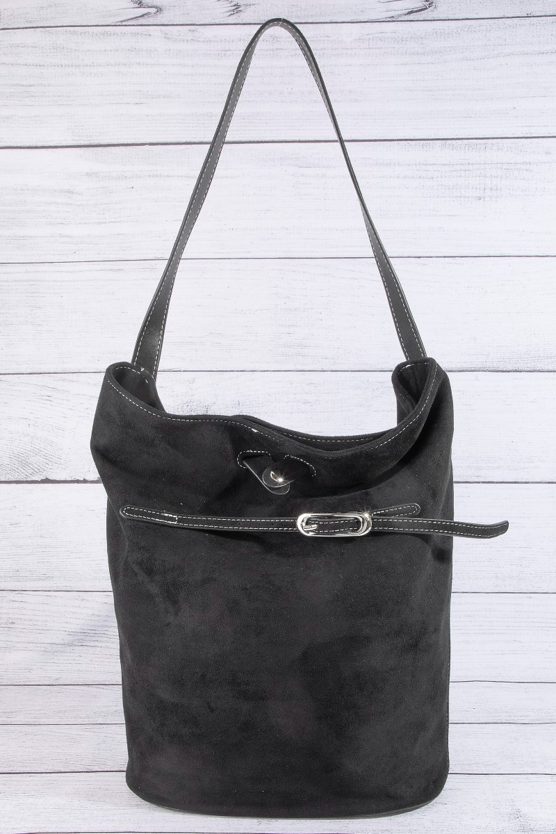 - This hand bag showcases a unique belt closure vegan leather bucket bag style. Explore a refined sense of style with this hand bag, seamlessly elevating the chic factor of your look.