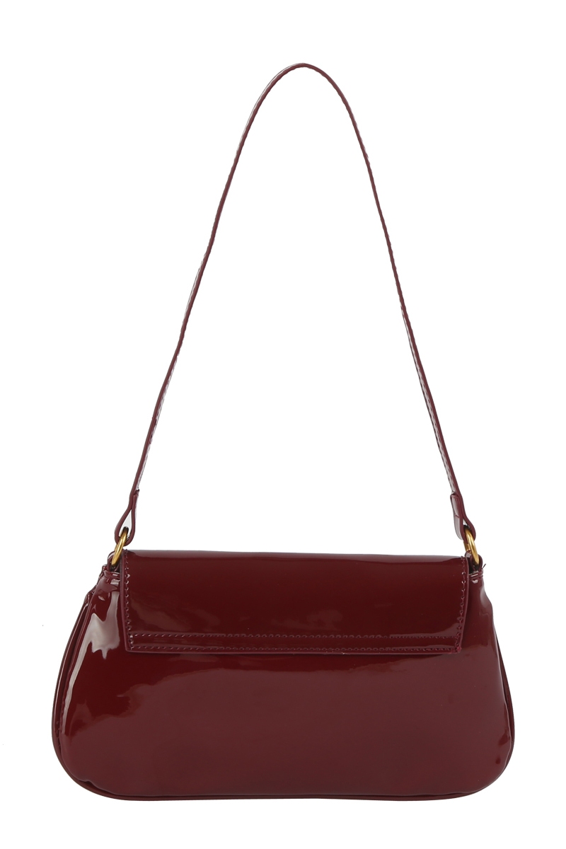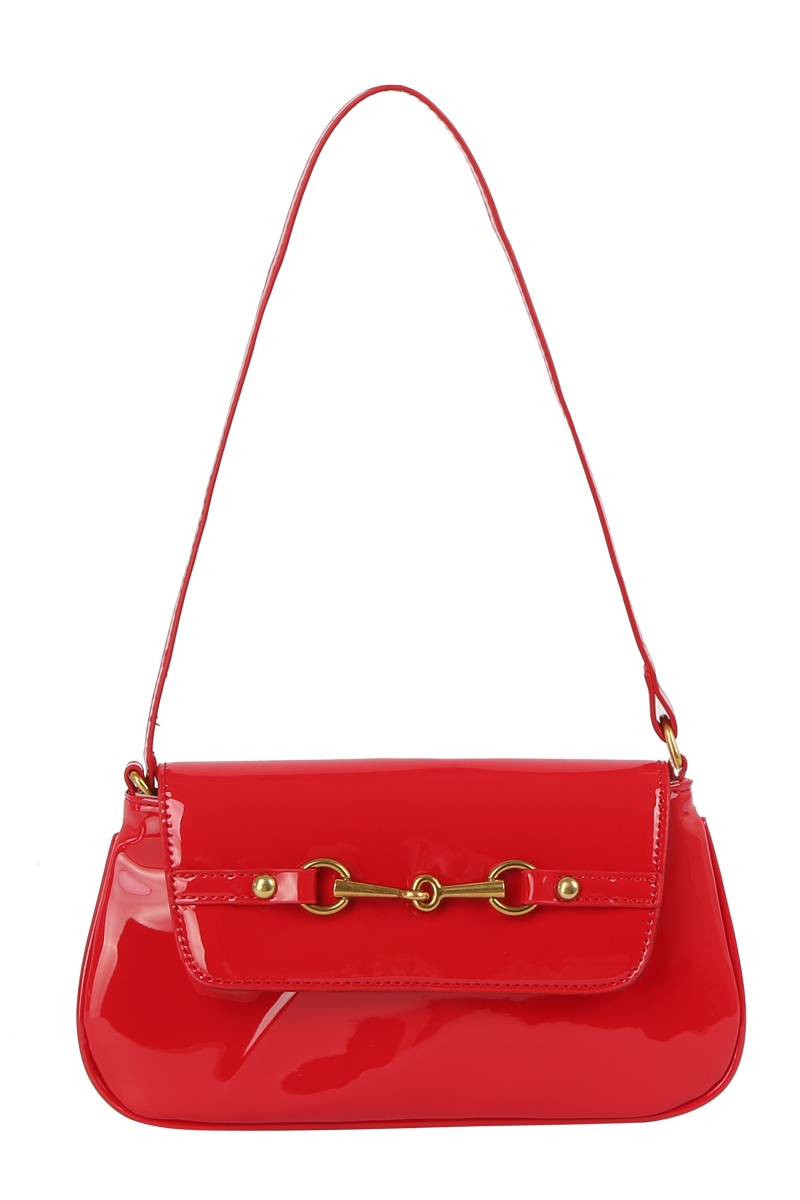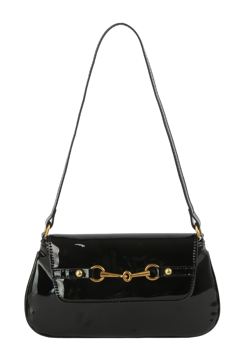 - This hand bag showcases a unique latch accent glossy leather style. Experience a subtle blend of modernity and classic charm as this hand bag effortlessly adorns your ensemble.