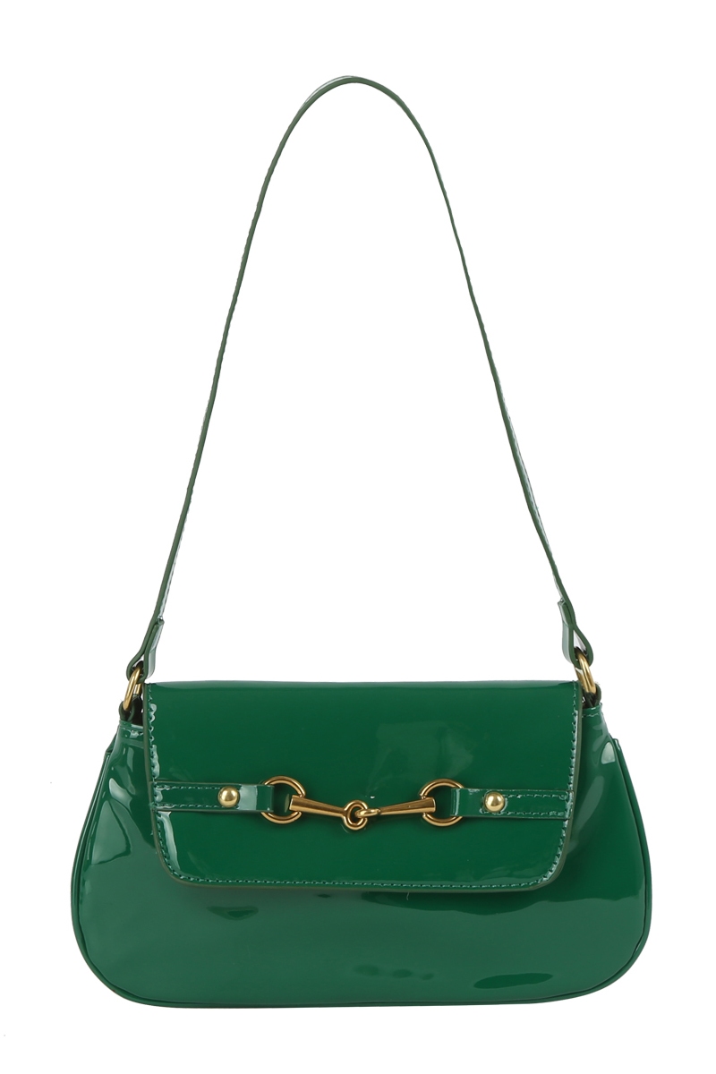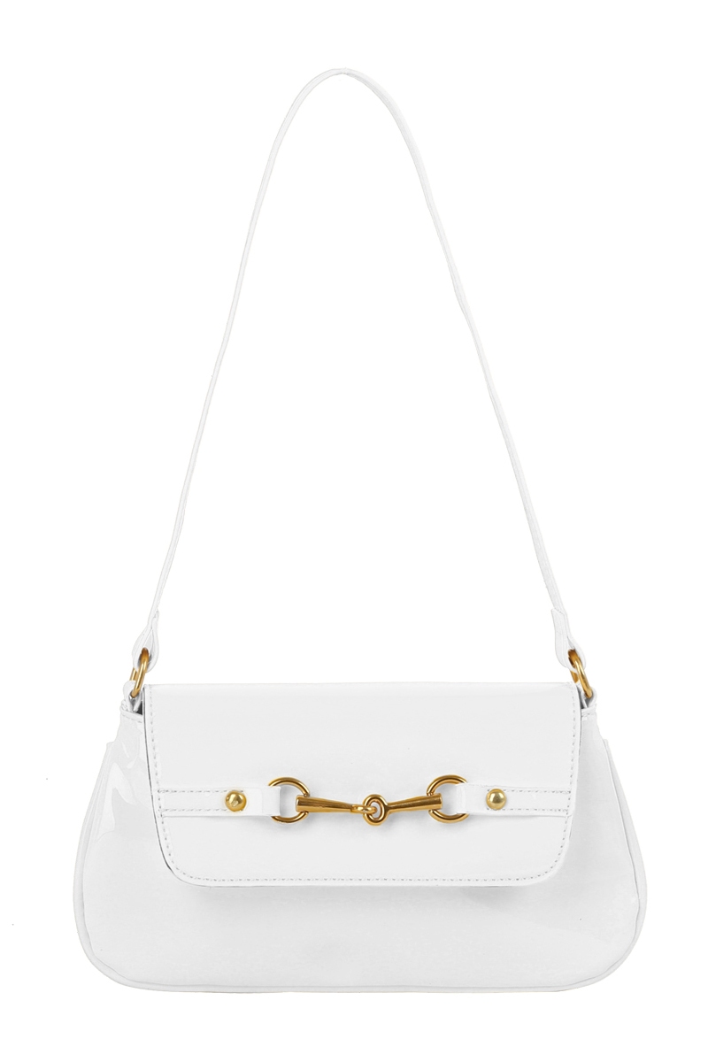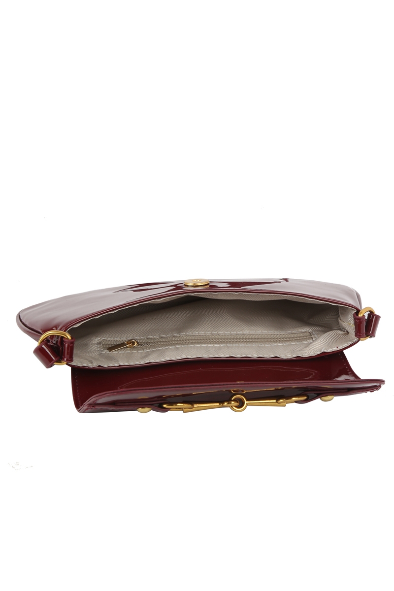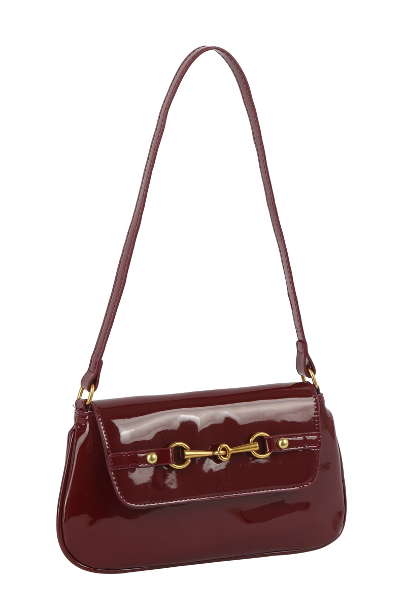 - This hand bag showcases a unique latch accent glossy leather style. Experience a subtle blend of modernity and classic charm as this hand bag effortlessly adorns your ensemble.
