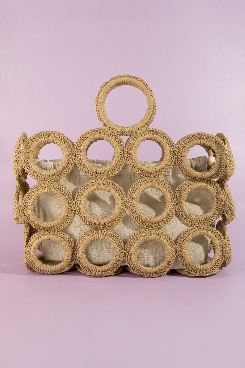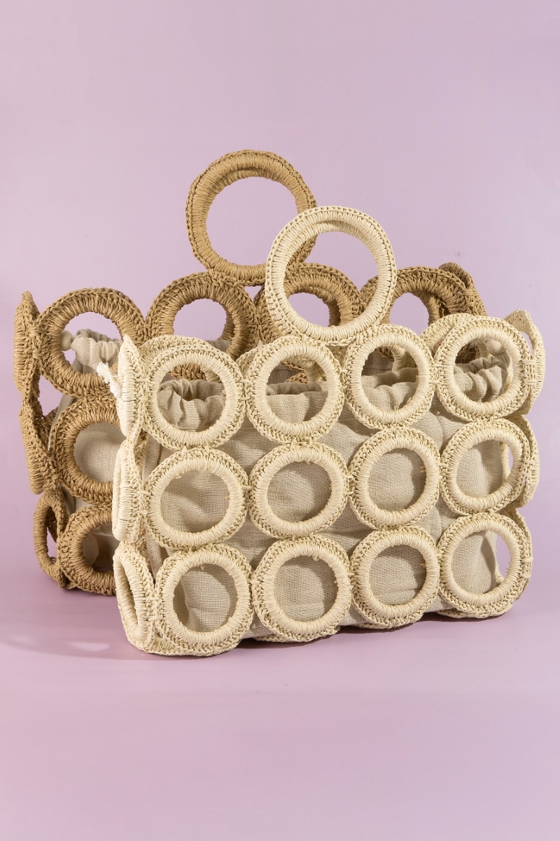 - This hand bag introduces a stunning straw hoop mesh style. Unveil modern elegance with this subtly intricate hand bag.