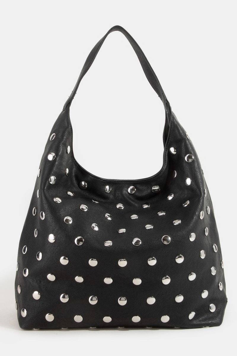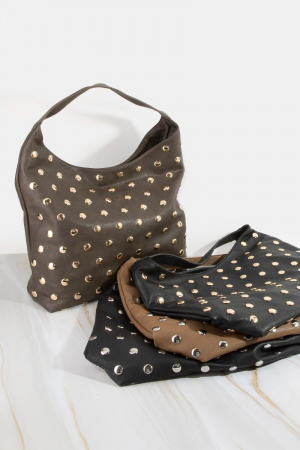 - This hand bag introduces a unique studded leather handbag style. Explore a refined sense of style with this hand bag, seamlessly elevating the chic factor of your look.
