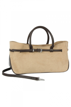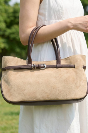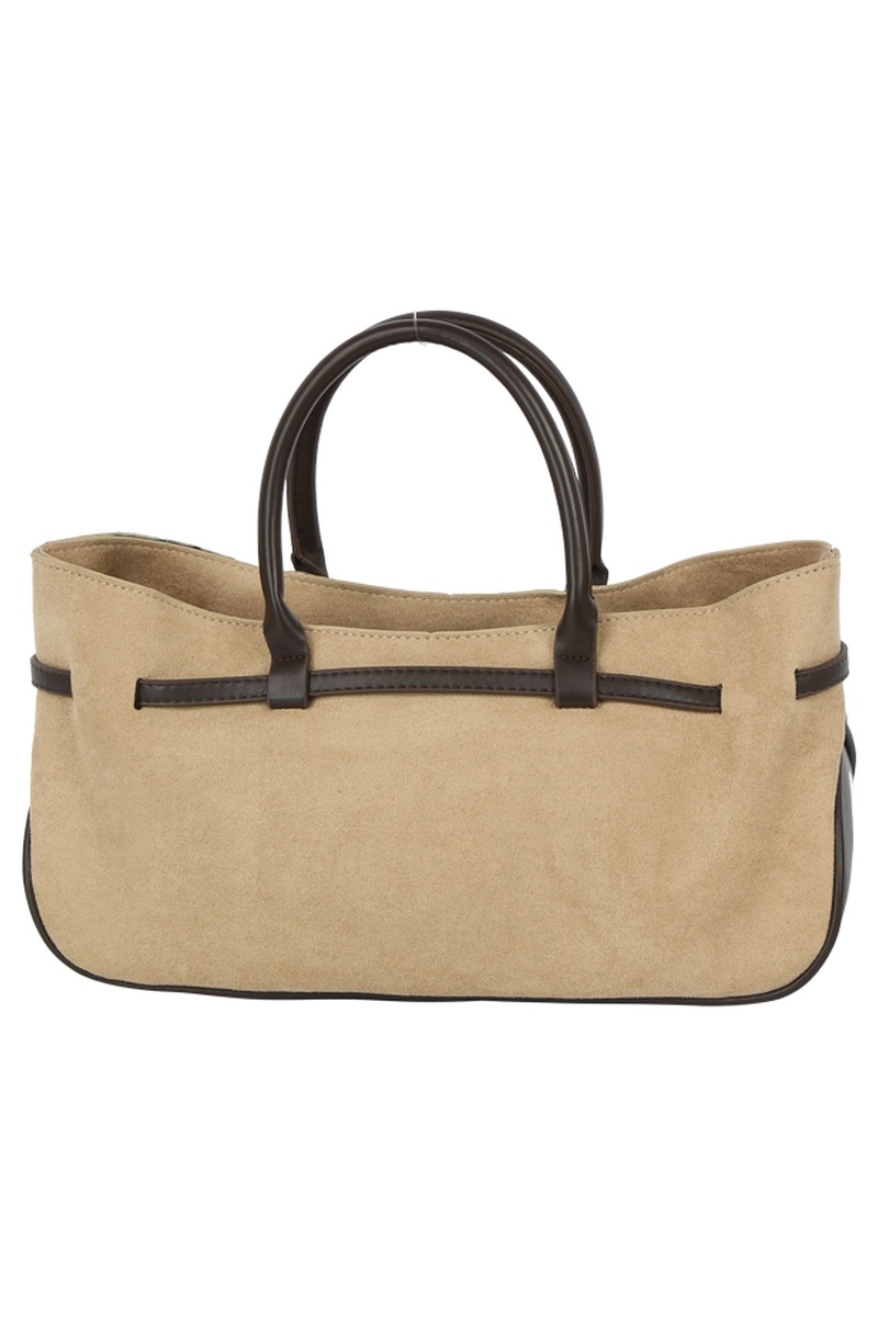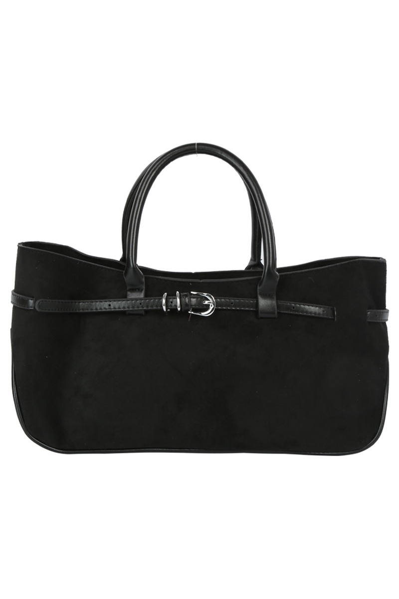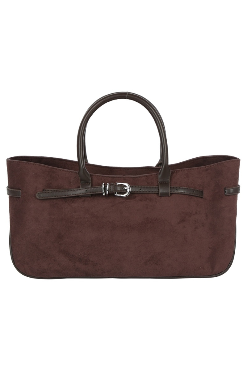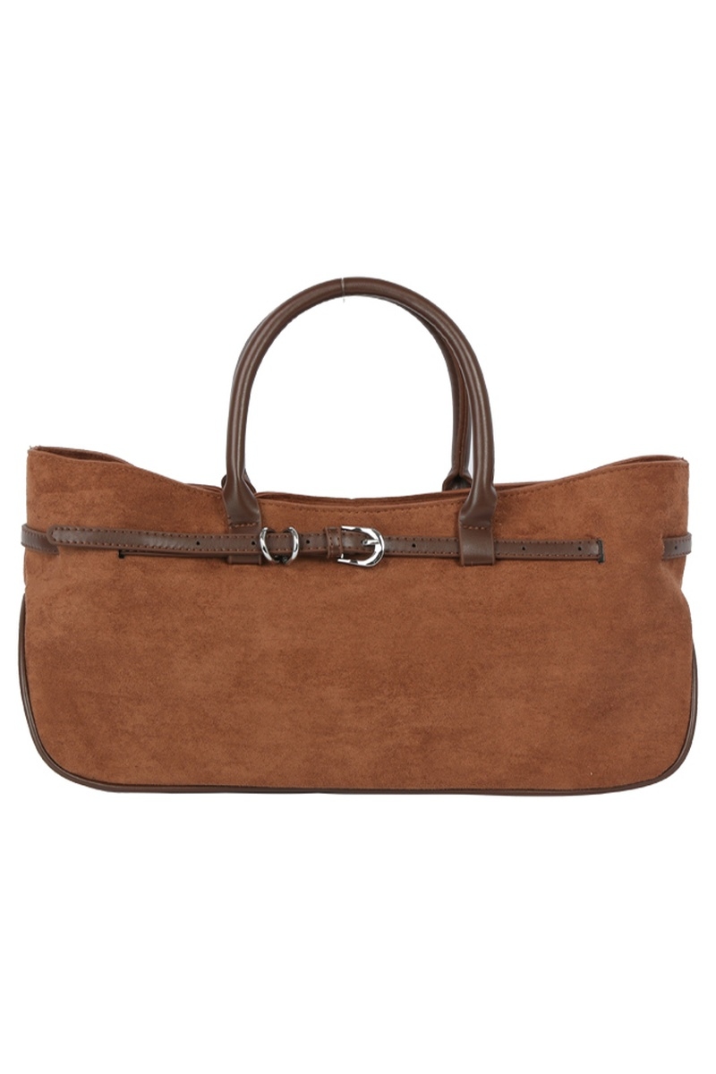 - This hand bag displays a fashionable wide faux suede belted satchel style. Experience the joy of accessorizing with this piece that effortlessly combines versatility and charm.