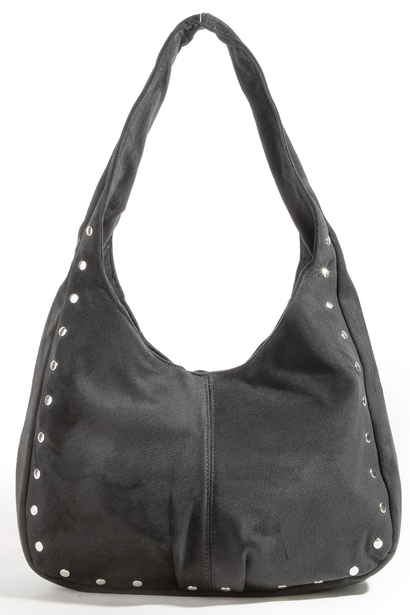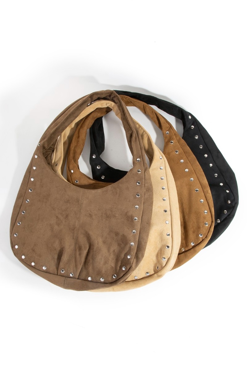 - This hand bag introduces a stunning faux suede studded trim hobo bag style. Explore a blend of classic charm and contemporary flair.