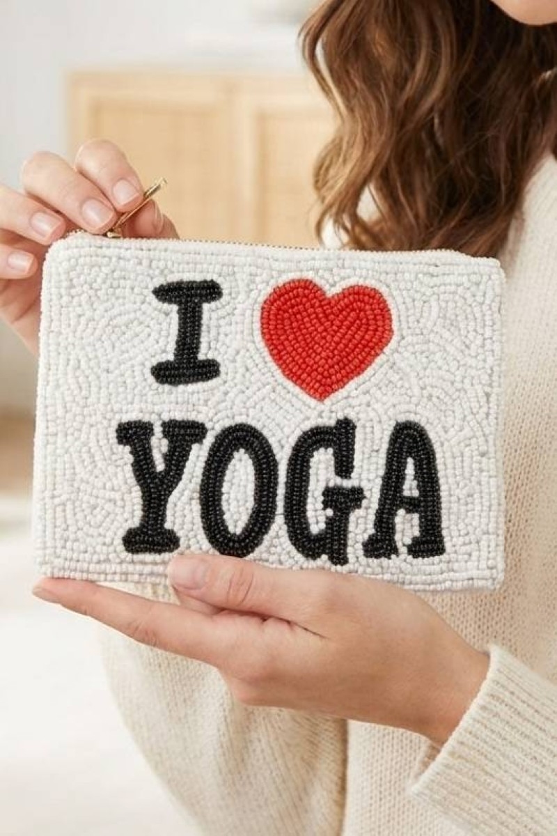 - This coin purse features a fashionable i love yoga beaded style. Unveil modern elegance with this subtly intricate coin purse.