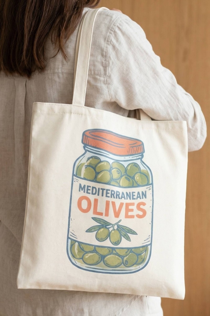 - This tote bag showcases a timeless mediterranean olives style. Elevate your ensemble with this tote bag that effortlessly captures the essence of refined fashion.
