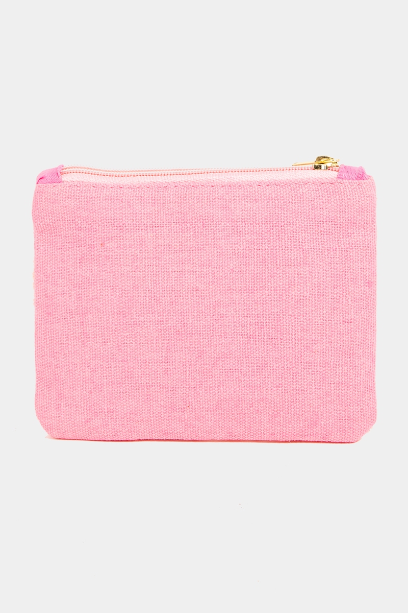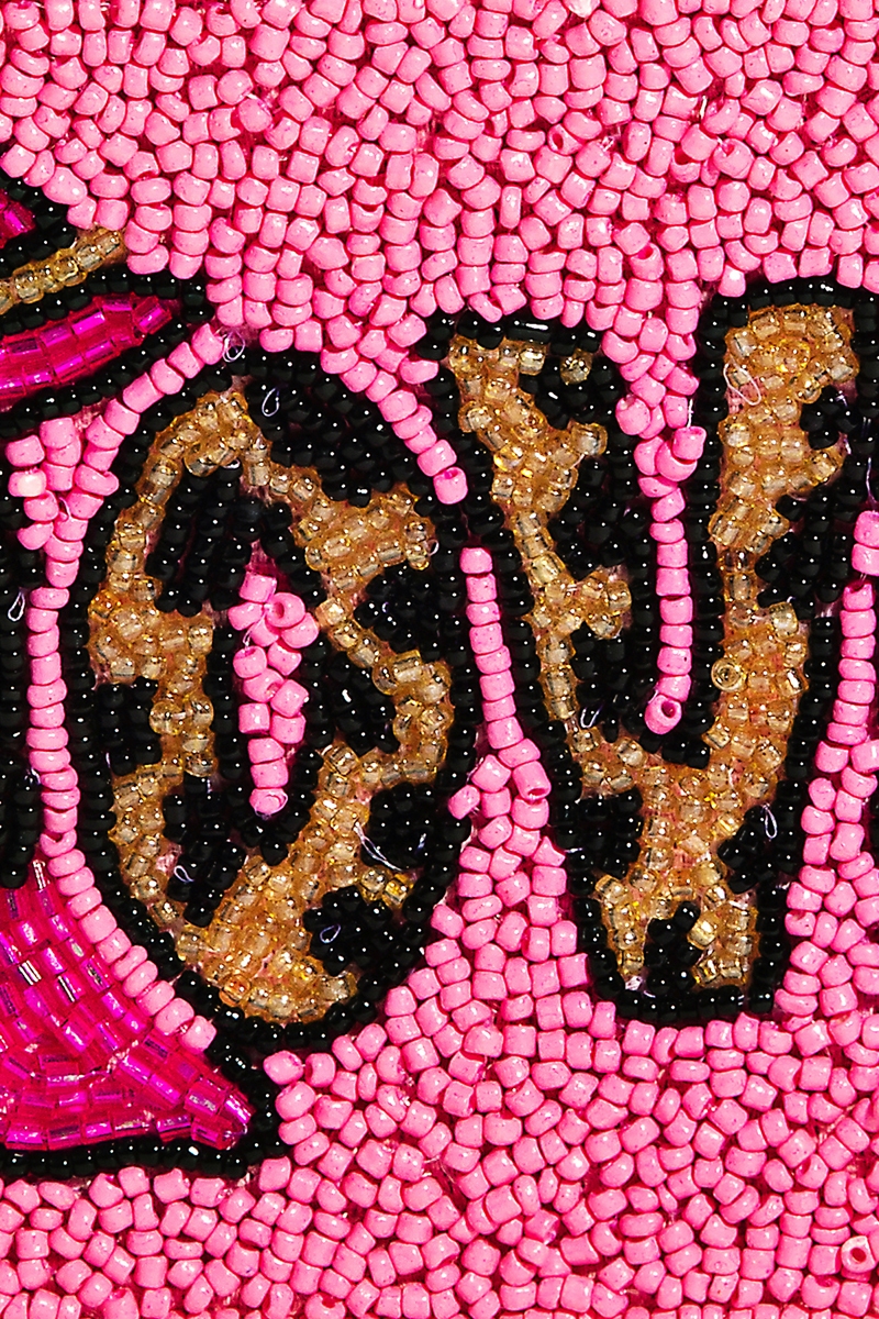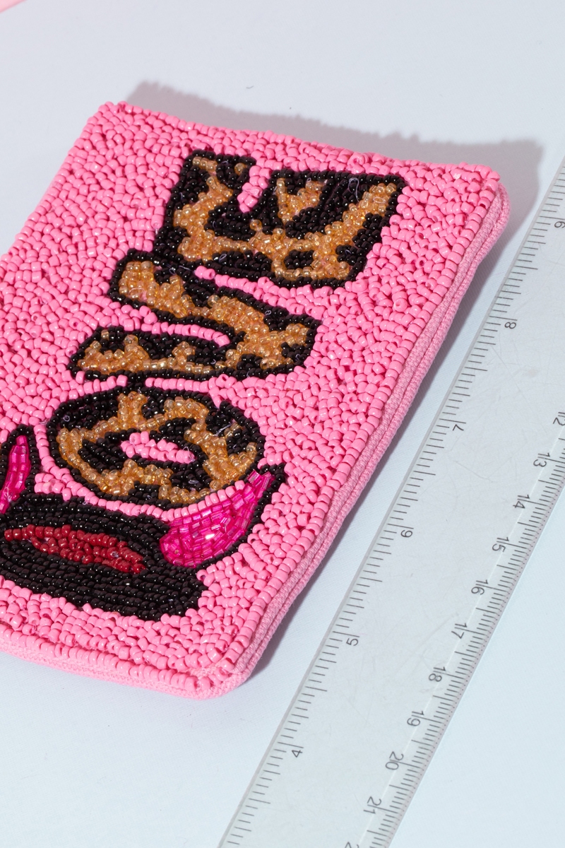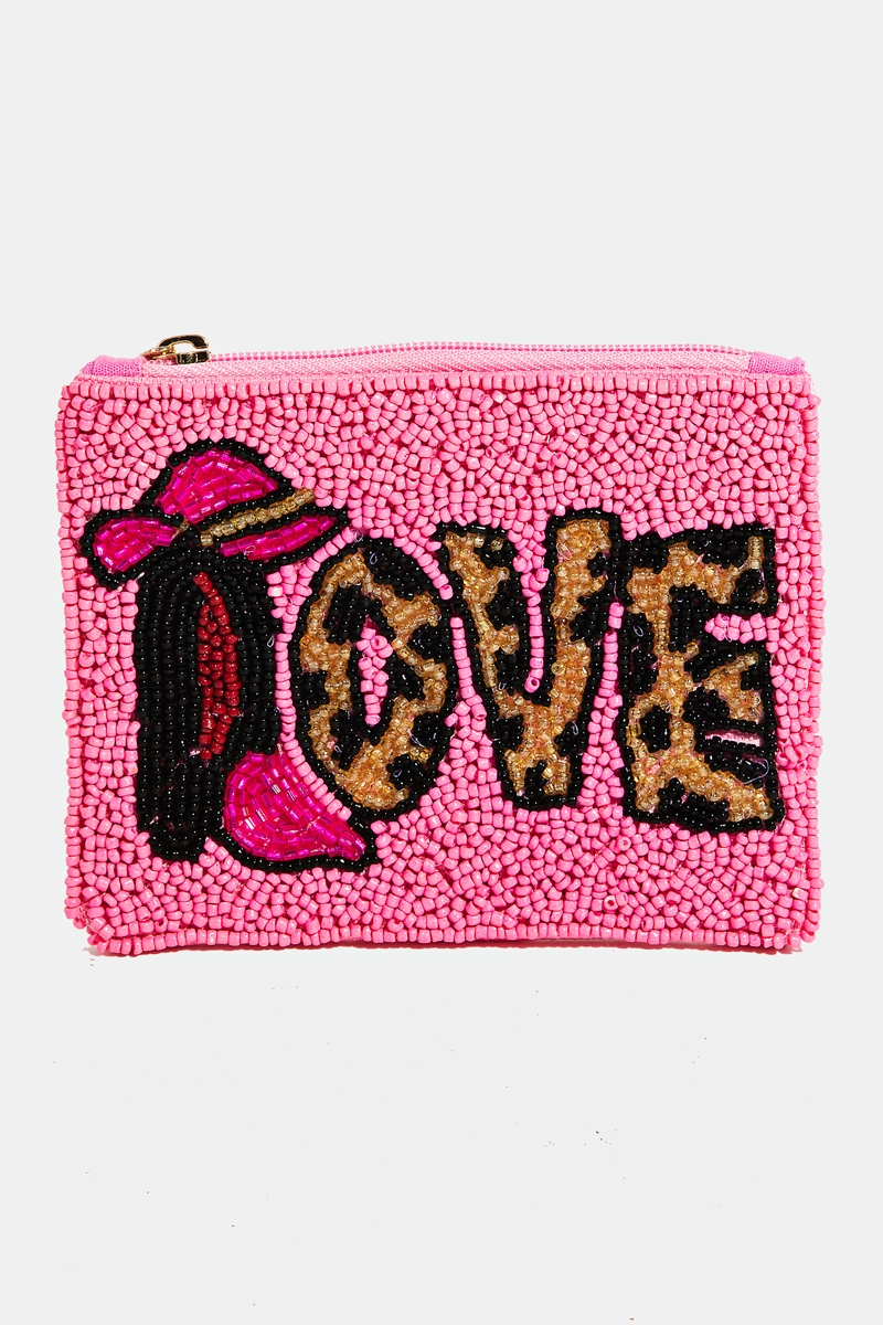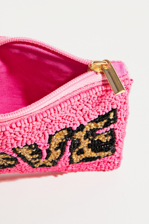- This displays a vibrant pink love print beaded coin purse style. Immerse yourself in the details of design, as this effortlessly becomes a conversation starter.