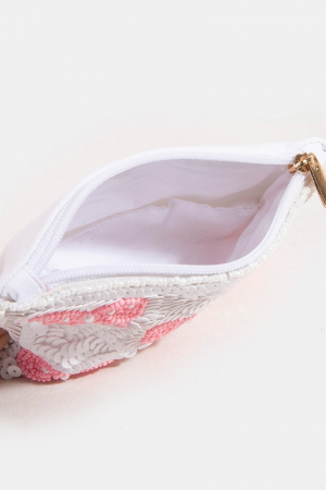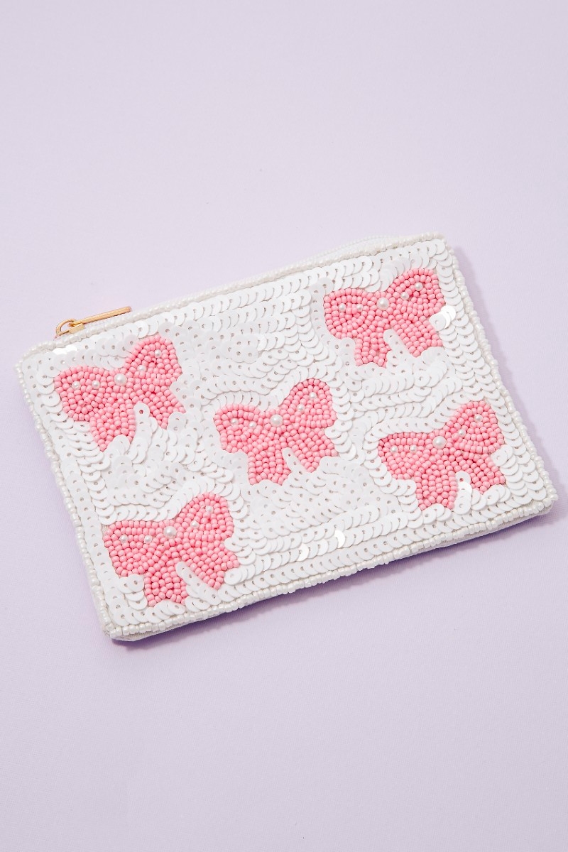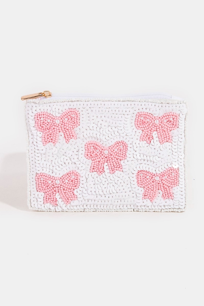 - This coin purse displays a vibrant pink pearl bead ribbon bow mixed beaded style. Unveil a new dimension of sophistication as this coin purse effortlessly enhances the elegance of your ensemble.