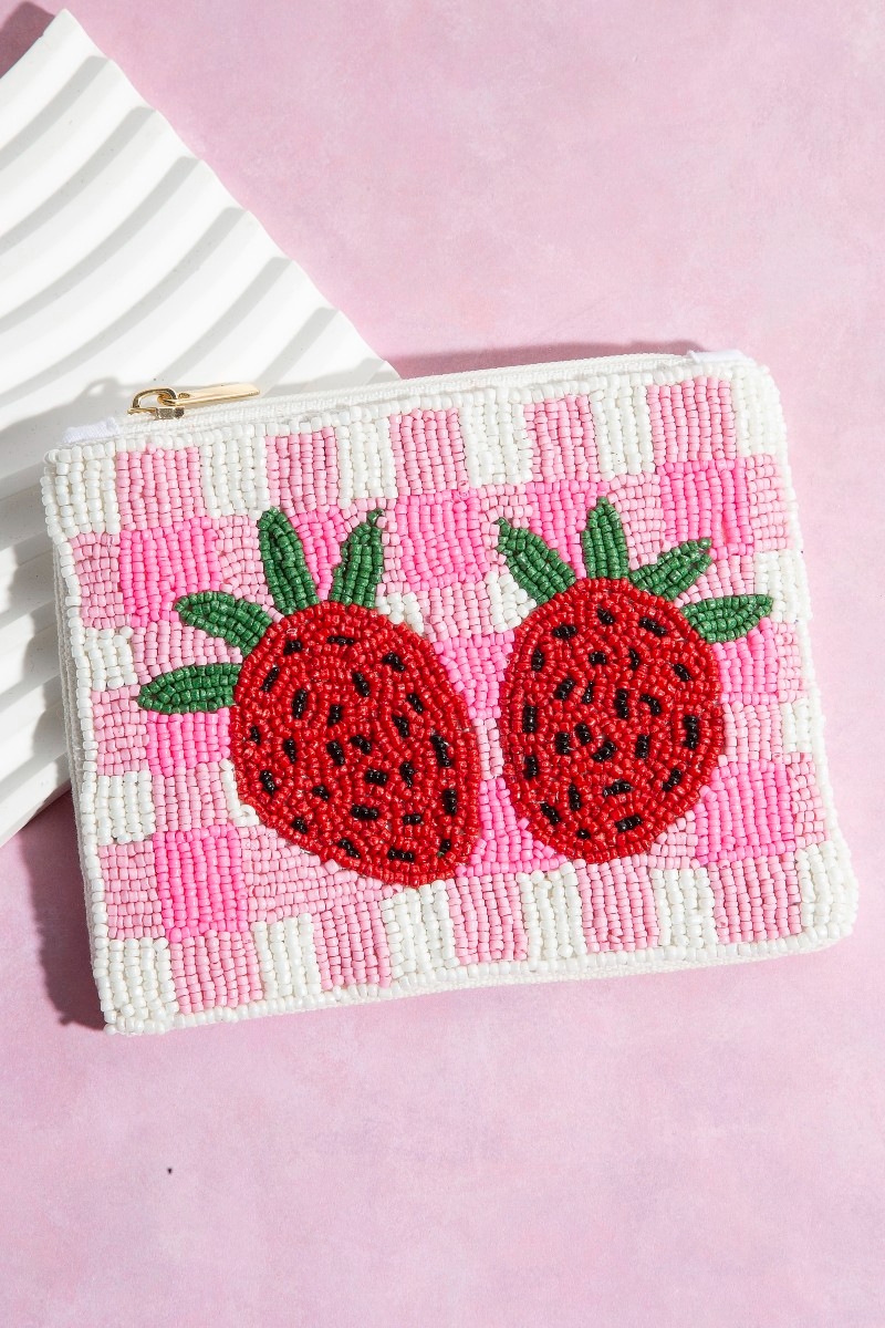 • This wallet adds a modern seed beaded double strawberry coin purse style. Immerse yourself in fashion finesse with this statement wallet.