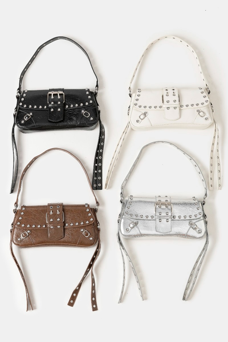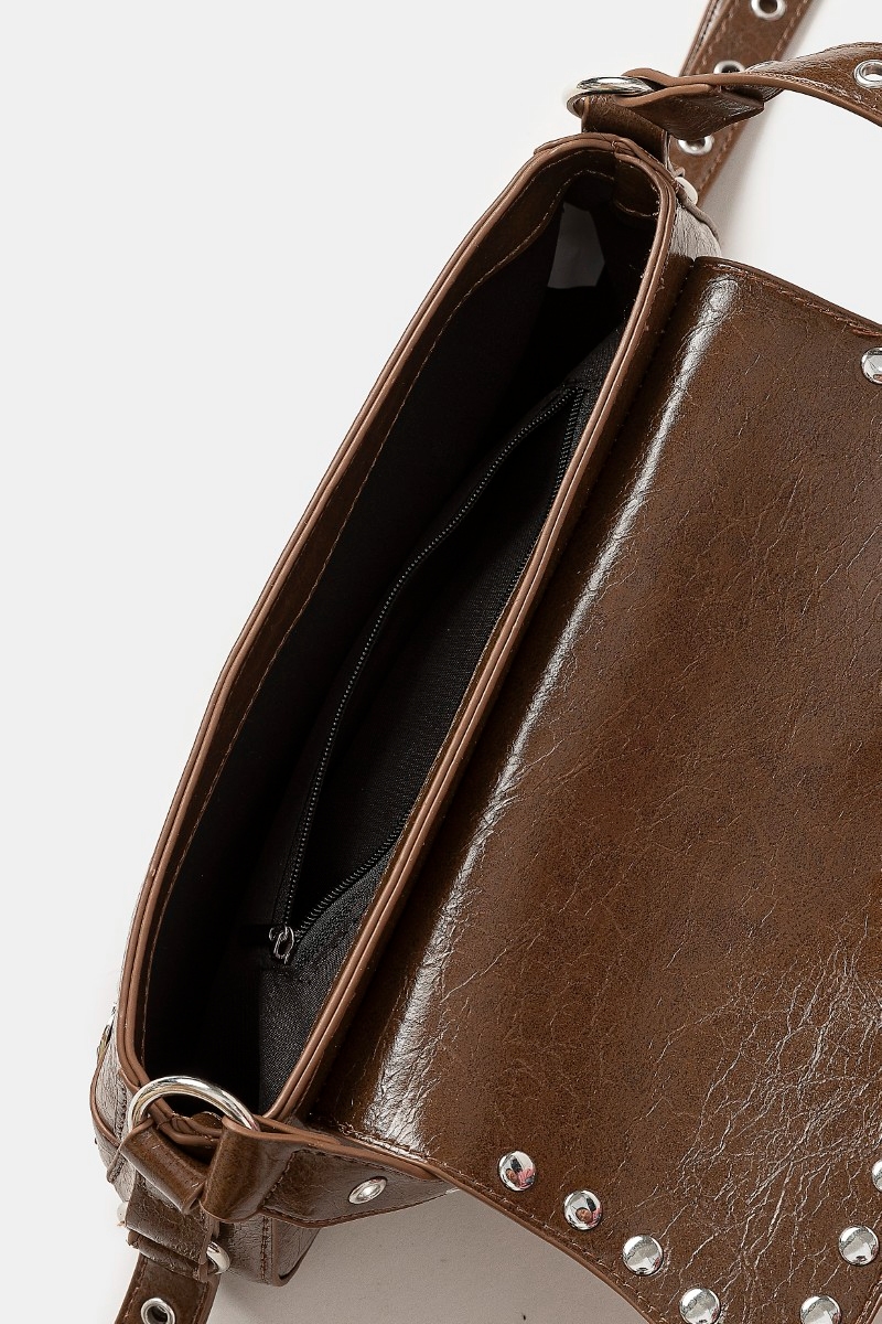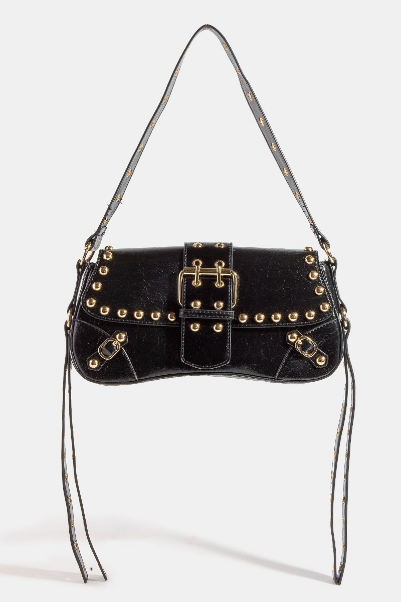 - This shoulder bag adds a modern glossy faux leather rivet trim style. Immerse yourself in the world of understated glamour as this shoulder bag effortlessly exudes timeless appeal.