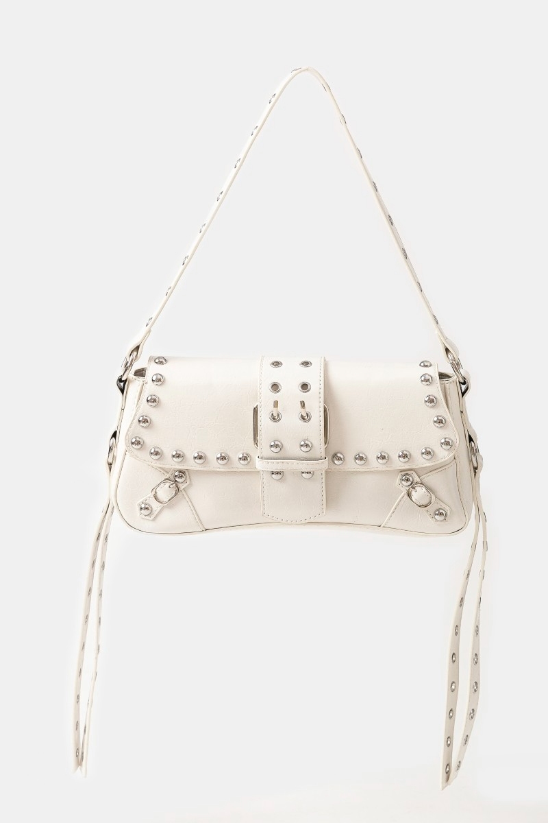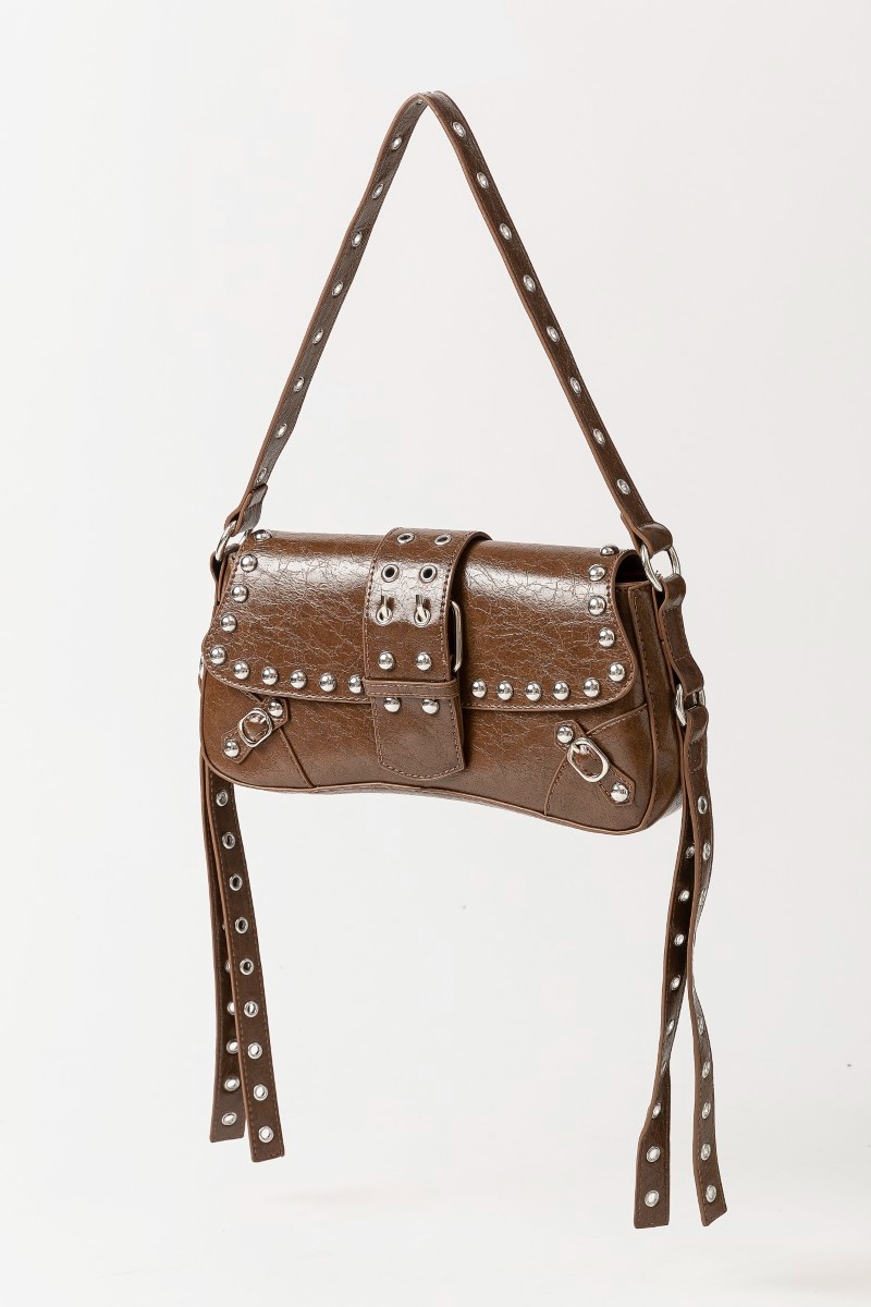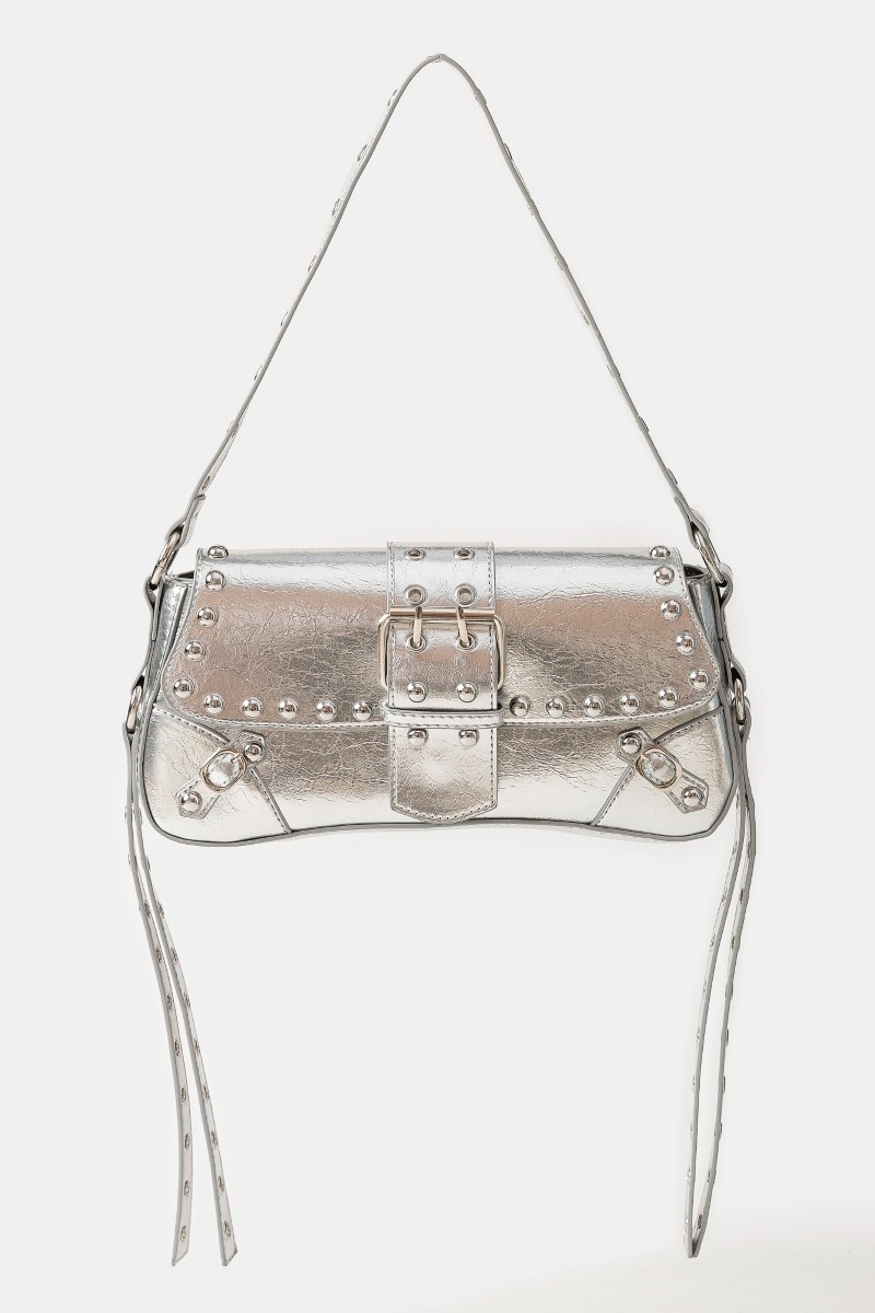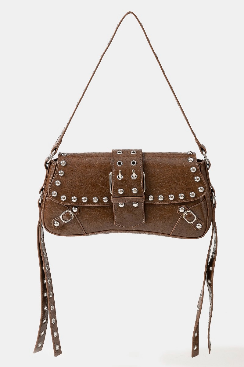 - This shoulder bag adds a modern glossy faux leather rivet trim style. Immerse yourself in the world of understated glamour as this shoulder bag effortlessly exudes timeless appeal.