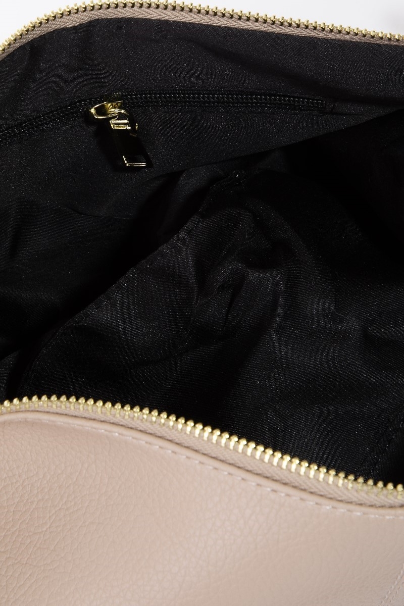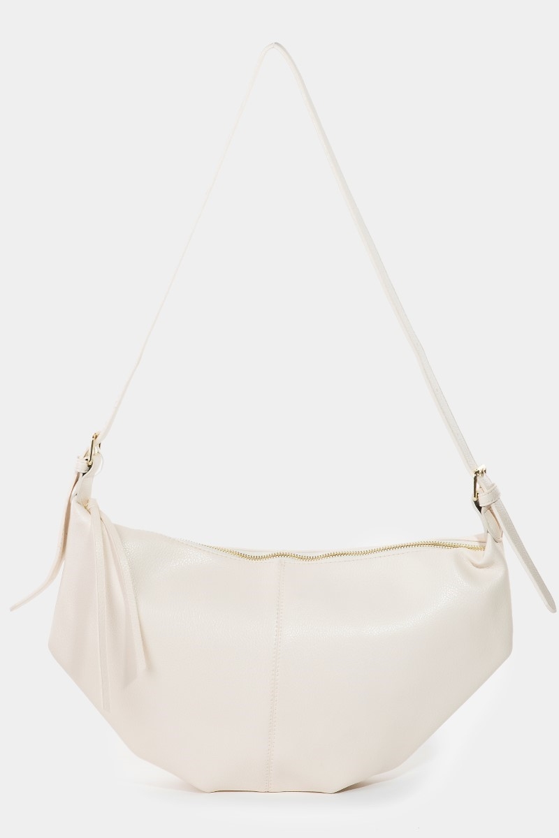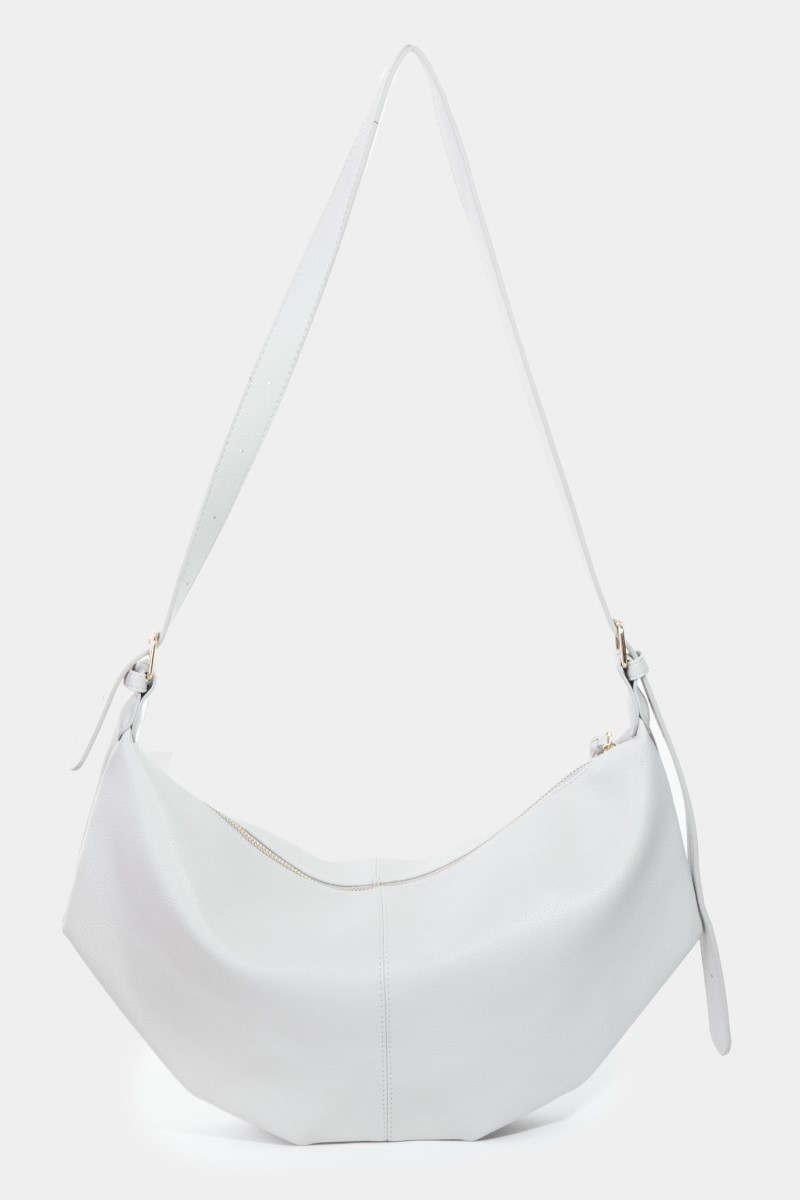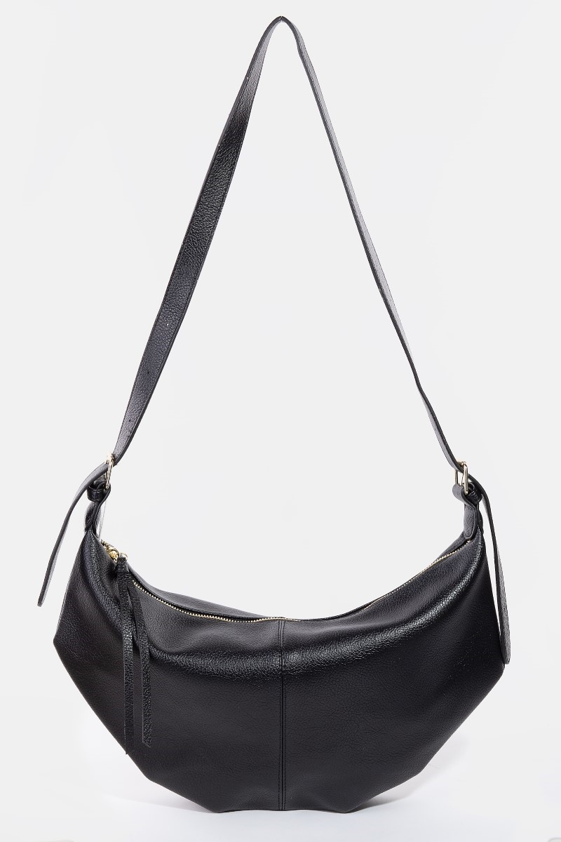 - This shoulder bag displays a fashionable faux leather semi circle style. Unveil modern elegance with this subtly intricate shoulder bag.