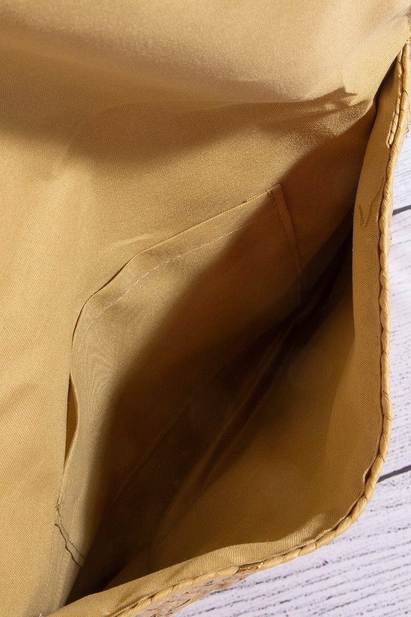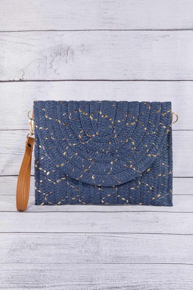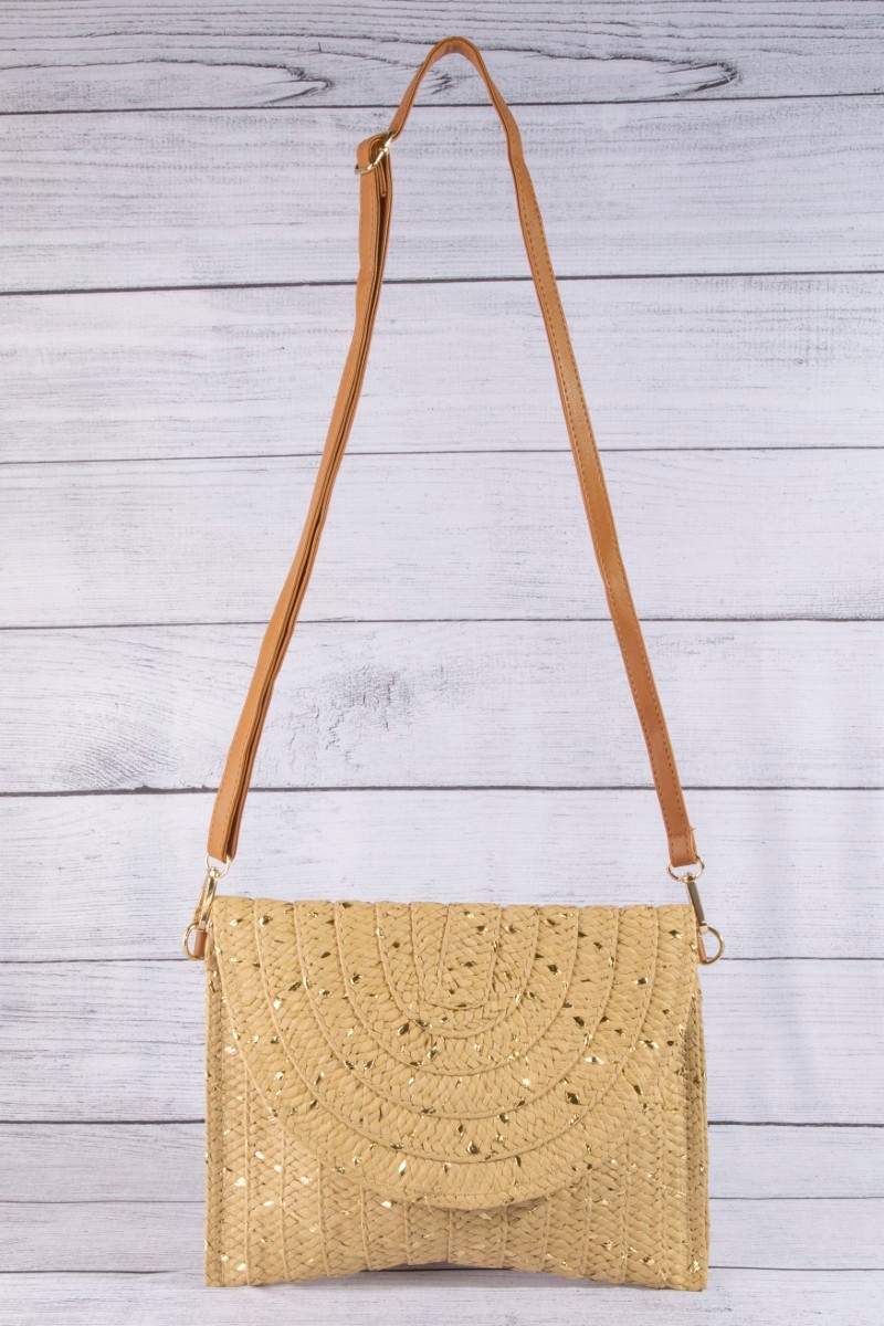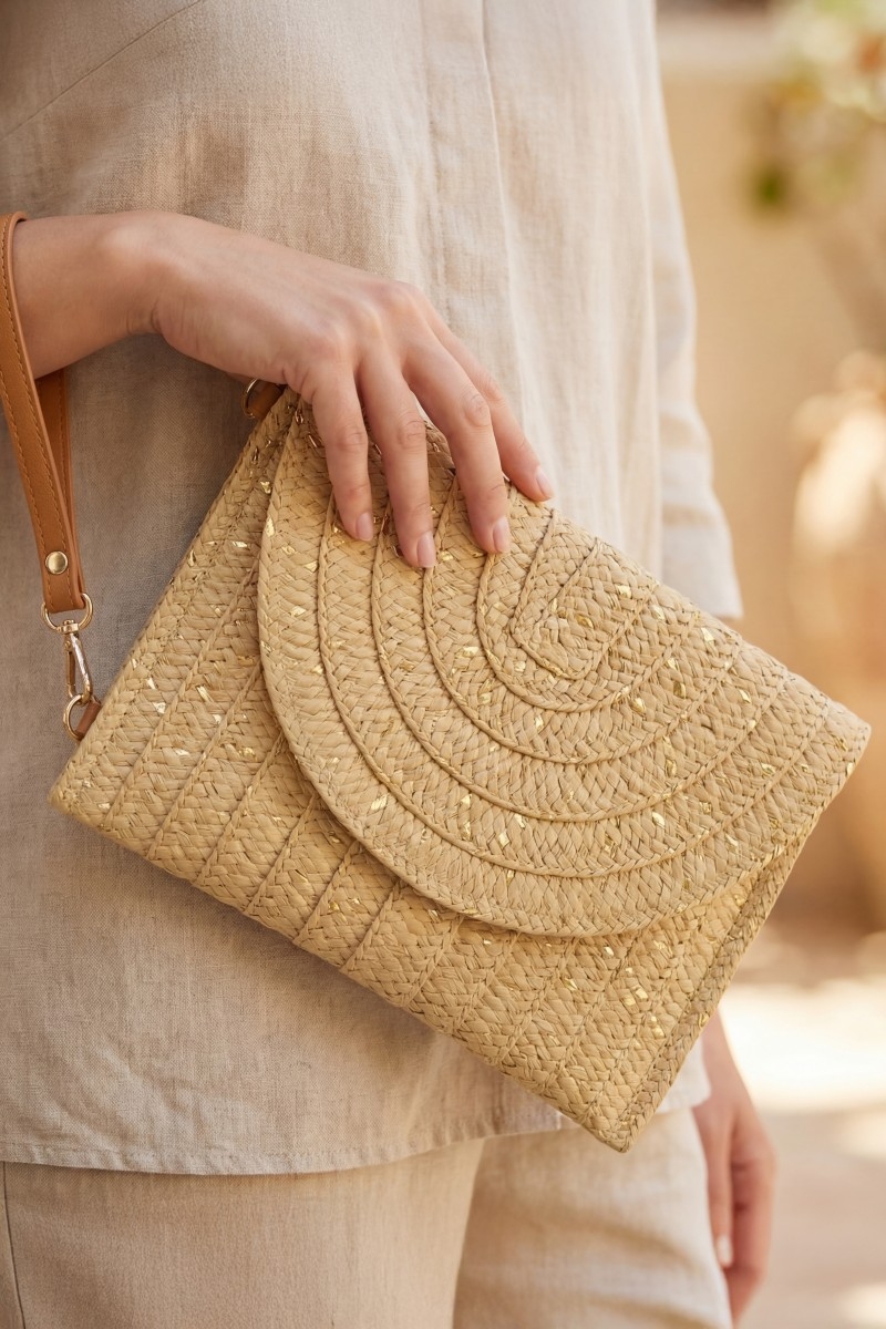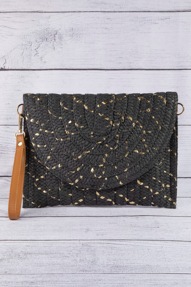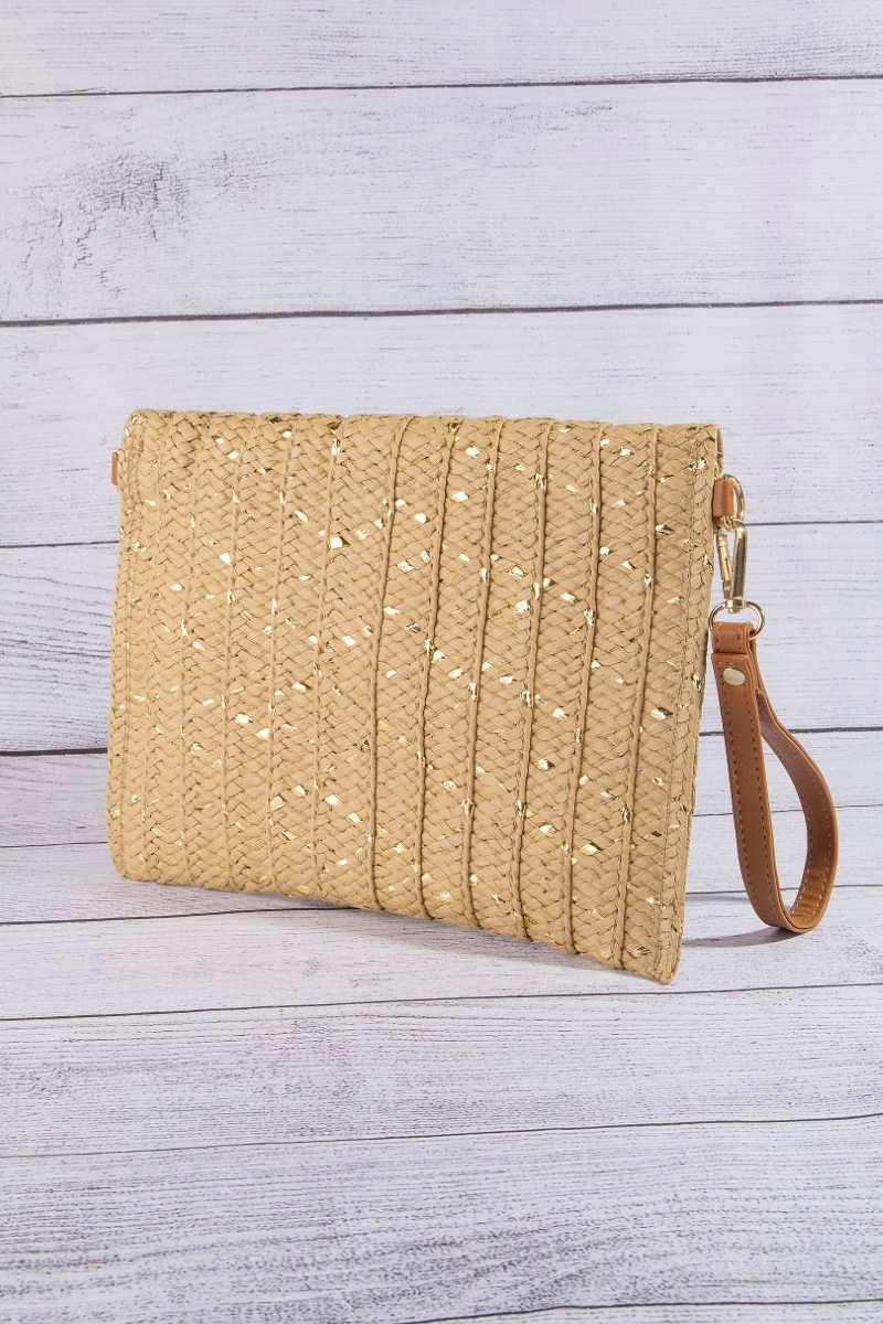 - This clutch bag displays a vibrant straw woven gold accents style. Elevate your ensemble with this chic, timeless clutch bag.
