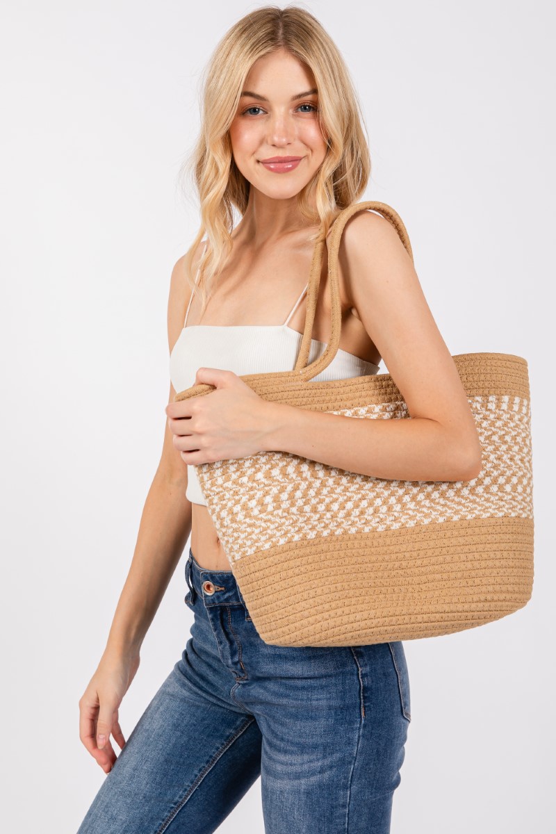 - This tote bag displays a fashionable braid pattern beach style. Immerse yourself in fashion finesse with this statement accessory.