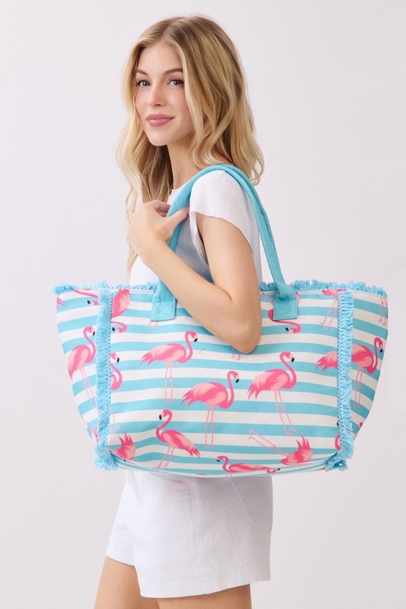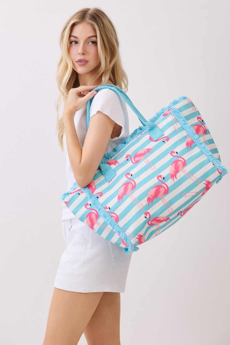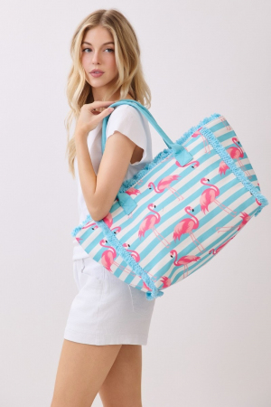 • This tote bag introduces a stunning flamingo print striped style. Explore a refined sense of style with this tote bag, seamlessly elevating the chic factor of your look.