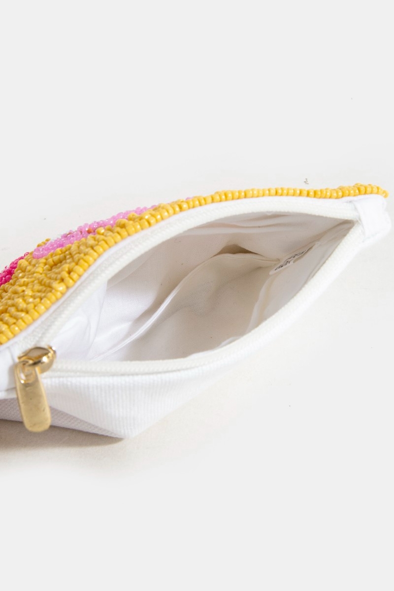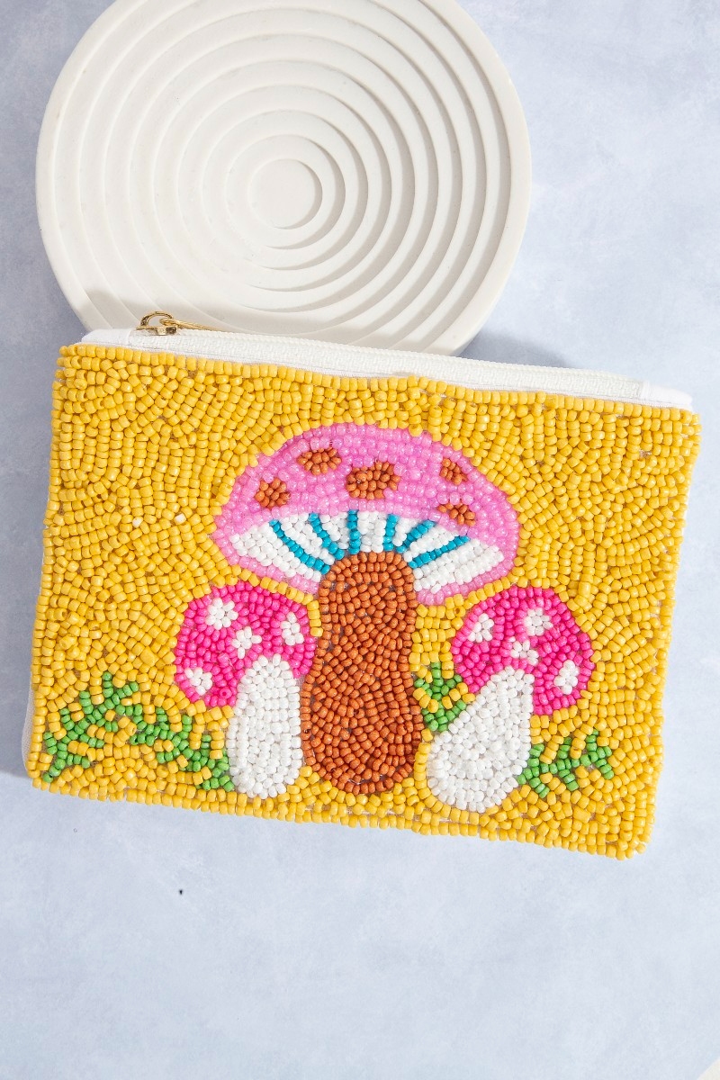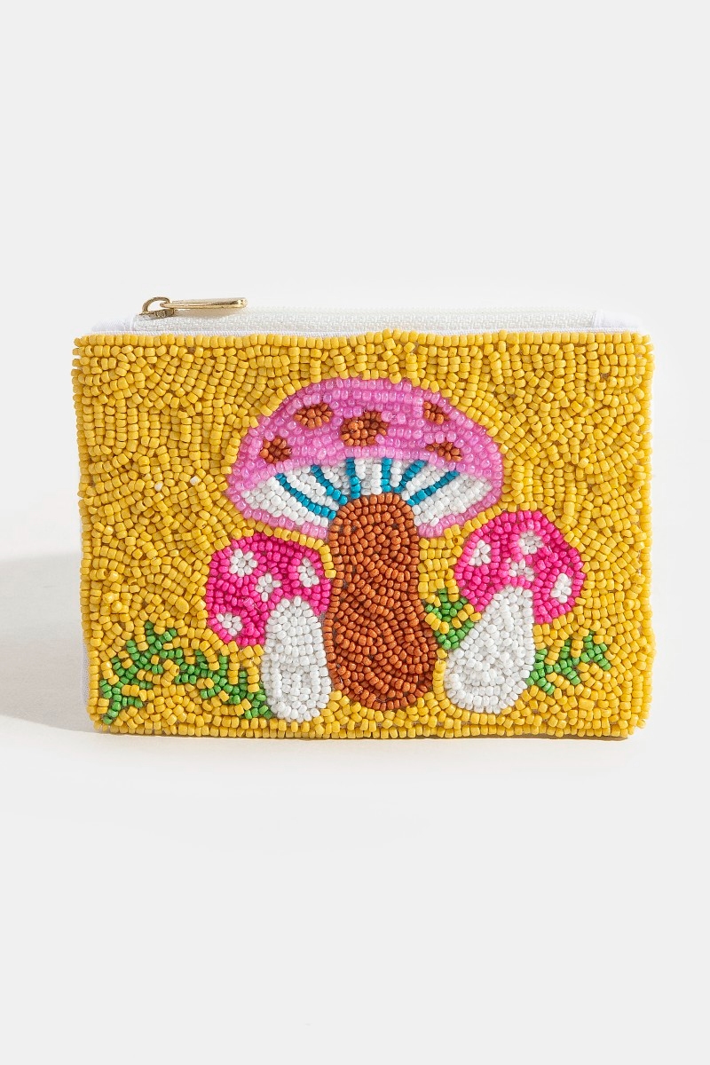 - This coin purse displays a fashionable vibrant mushrooms seed beaded style. Embark on a journey of sartorial refinement as this coin purse effortlessly complements your fashion sense.