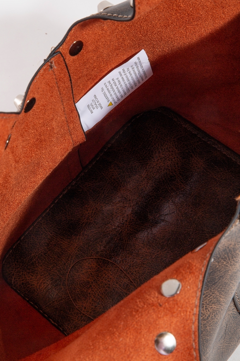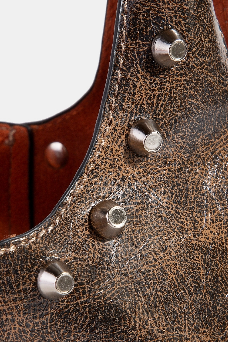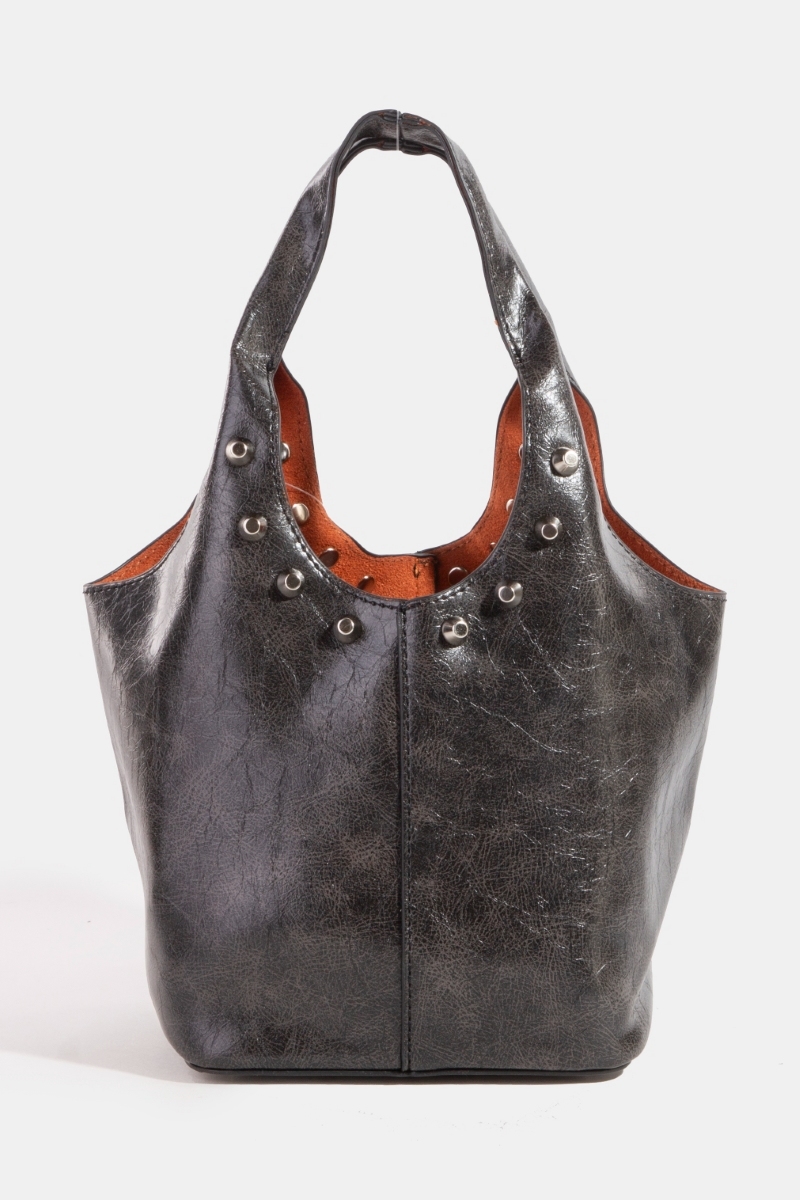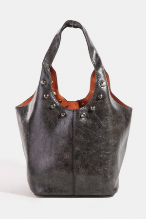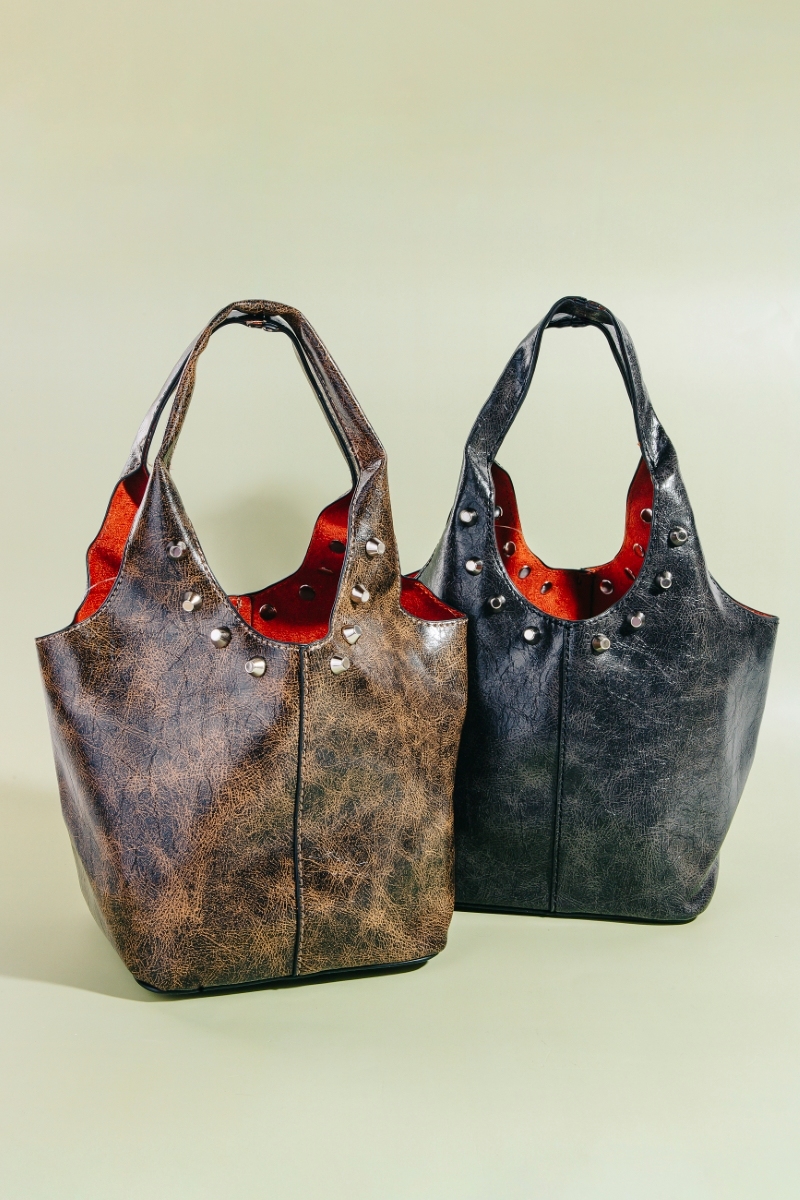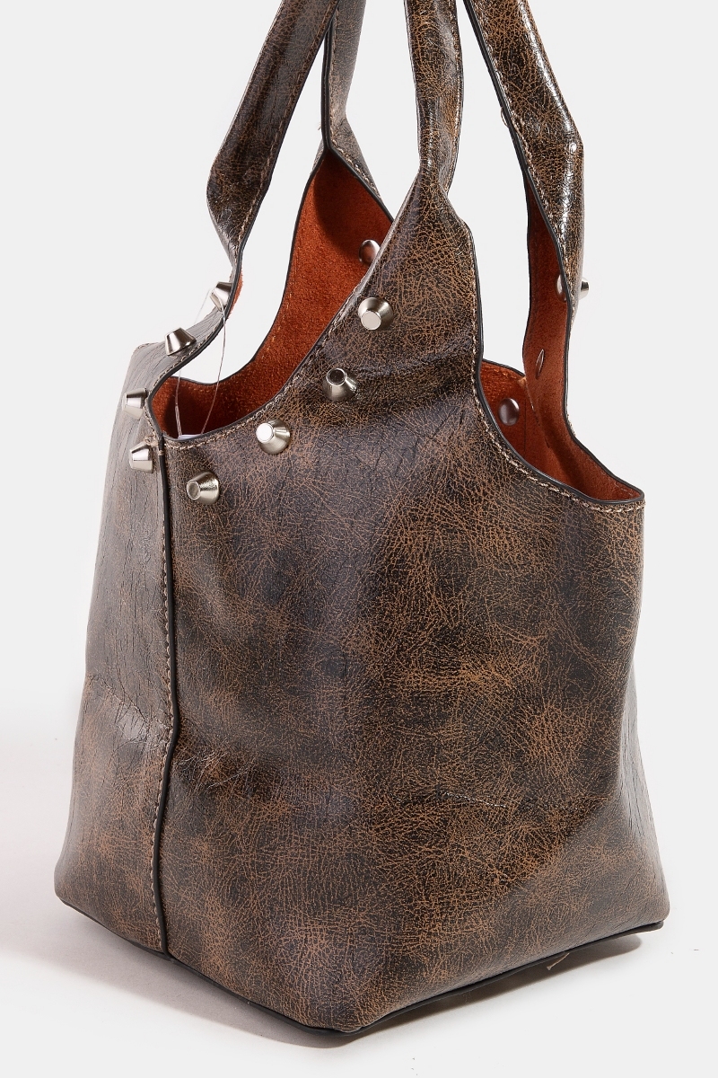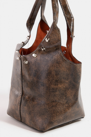 • This hand bag showcases a timeless weathered faux leather and studs bucket bag style. Immerse yourself in fashion finesse with this statement hand bag.