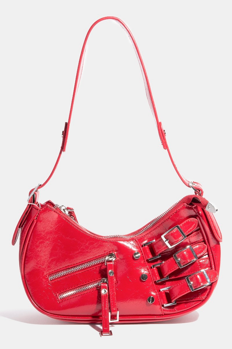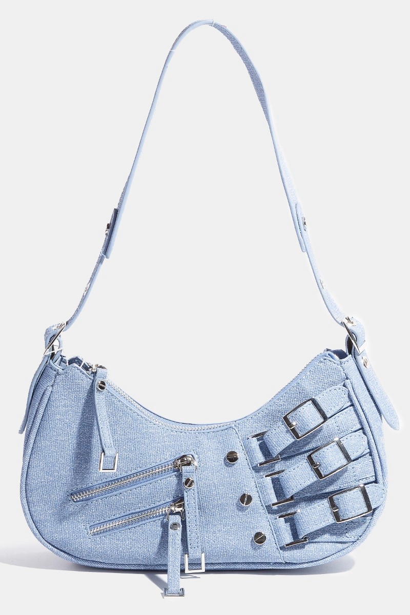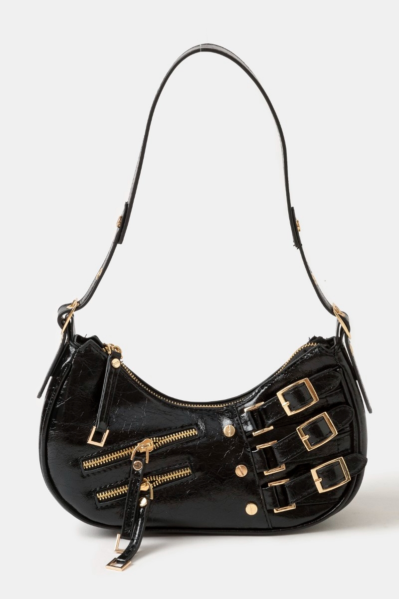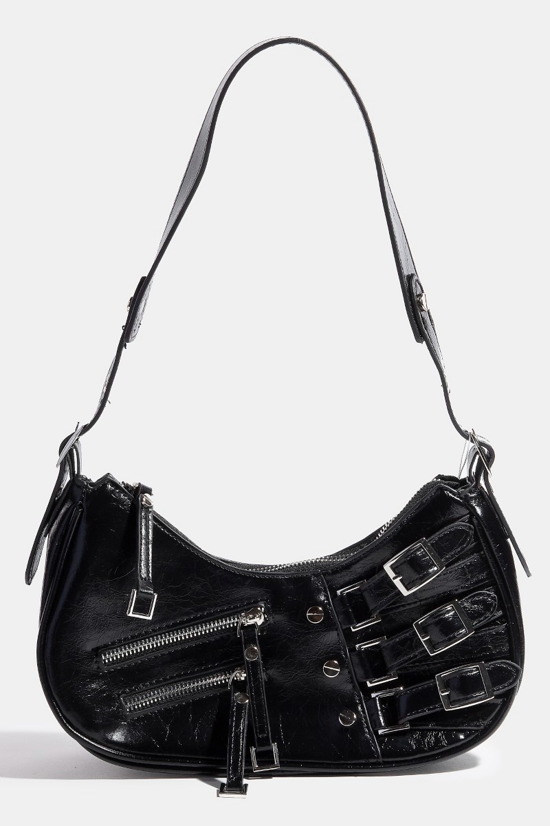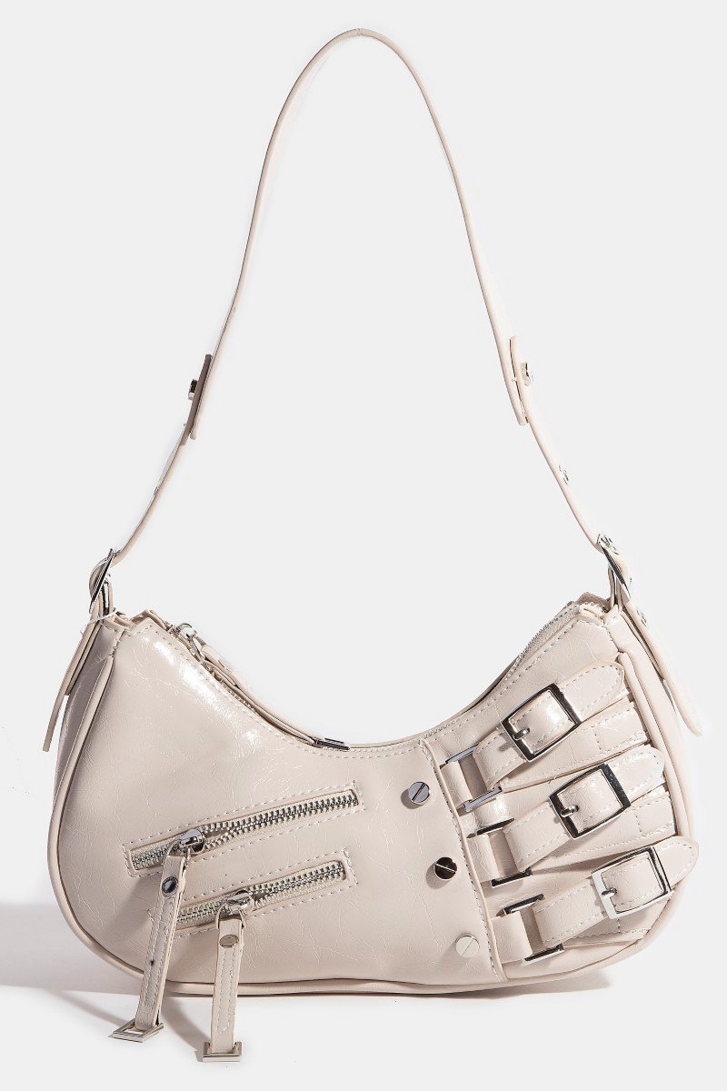 - This shoulder bag features a fashionable zipper and belts accent style. Redefine your look effortlessly with this standout, on-trend piece.
