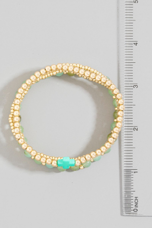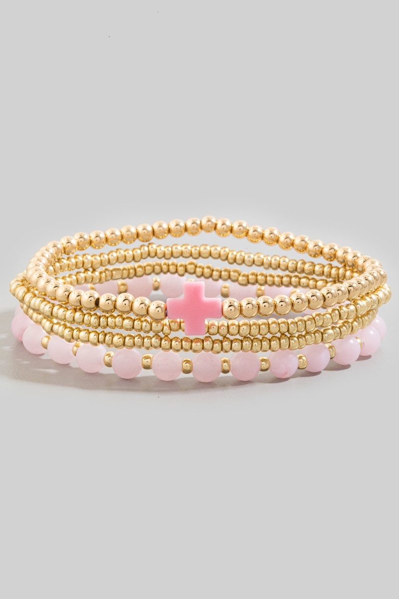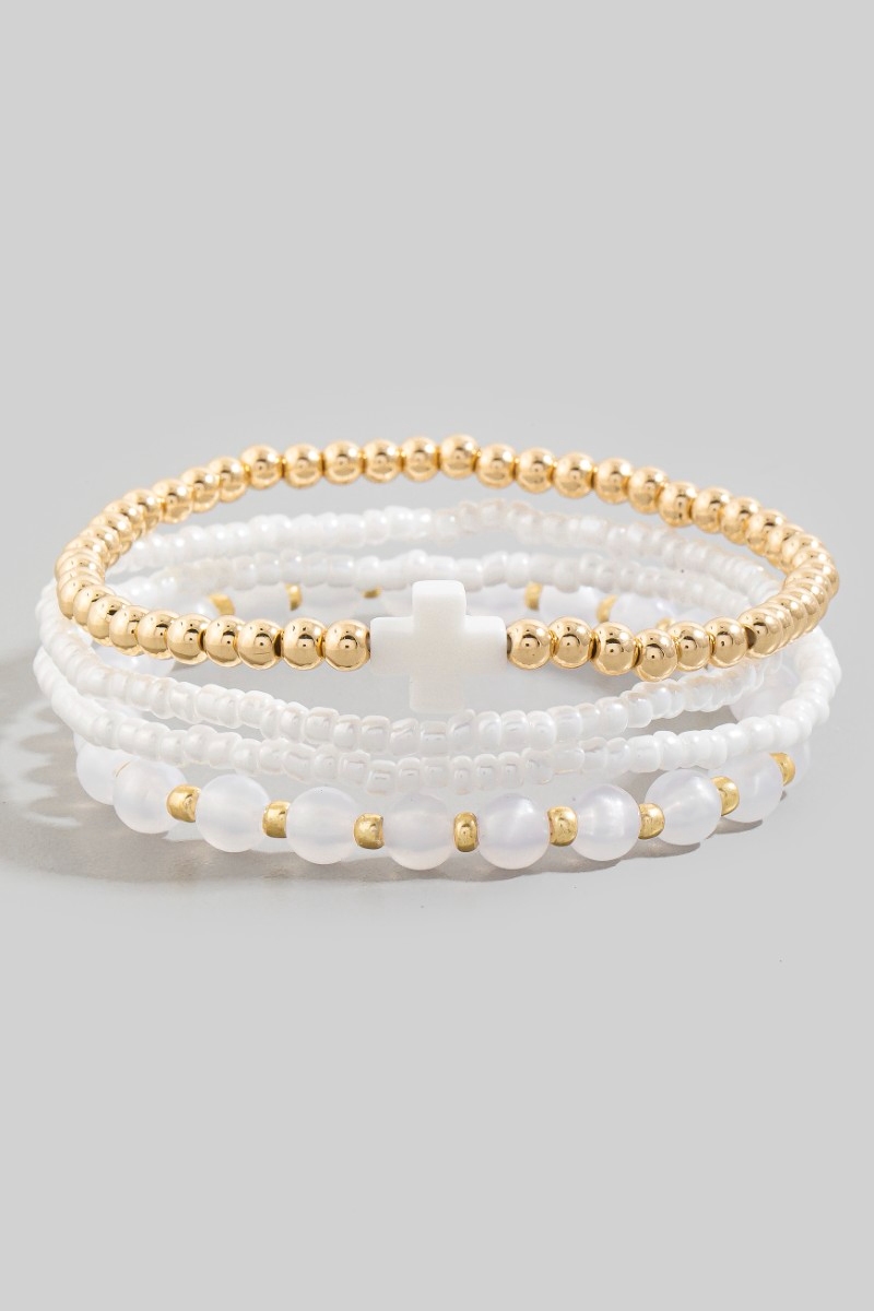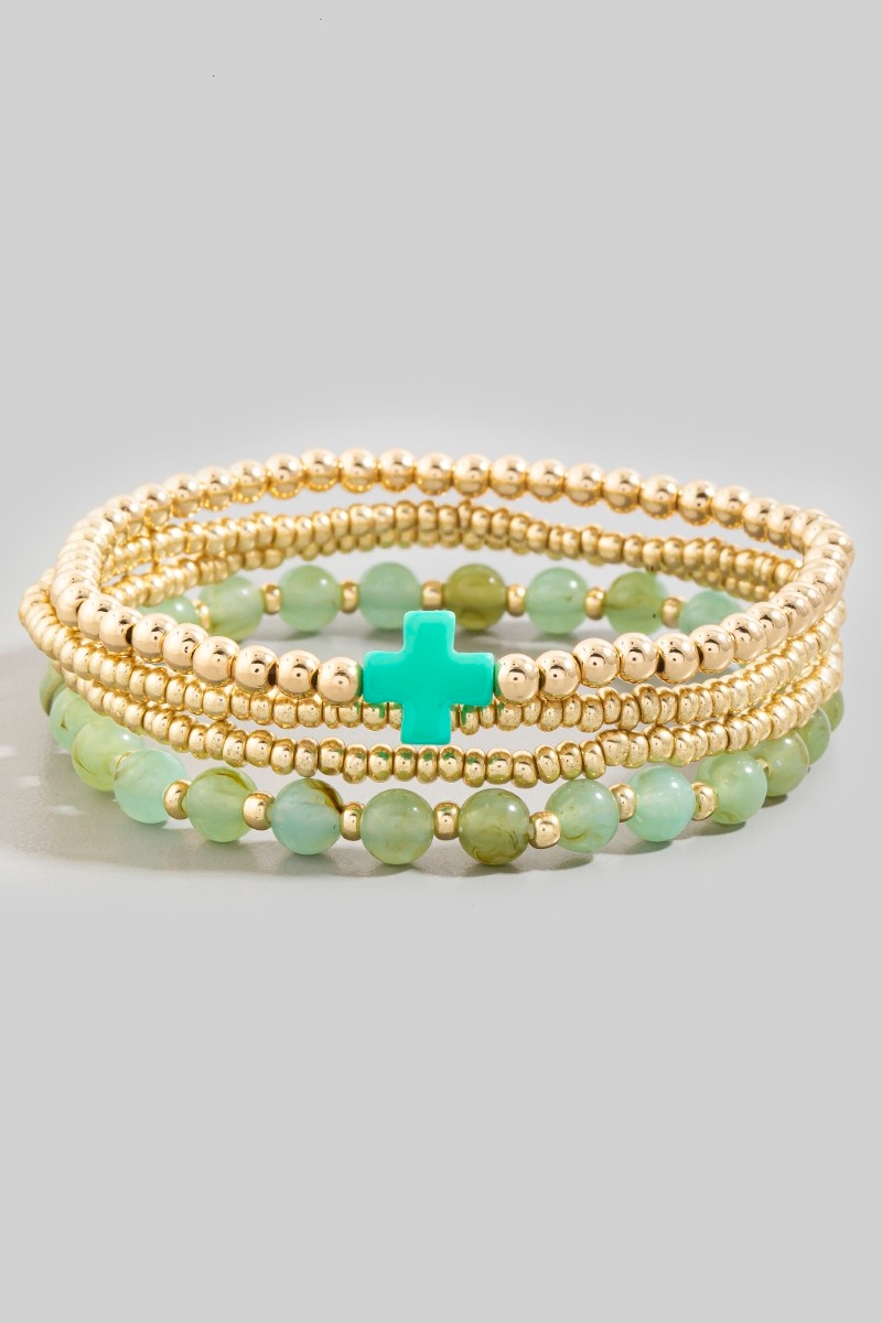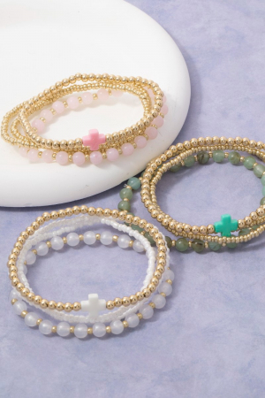 • This bracelet features a fashionable cross charm glass and metallic beaded set style. Experience refined sophistication with this understated yet stylish piece.