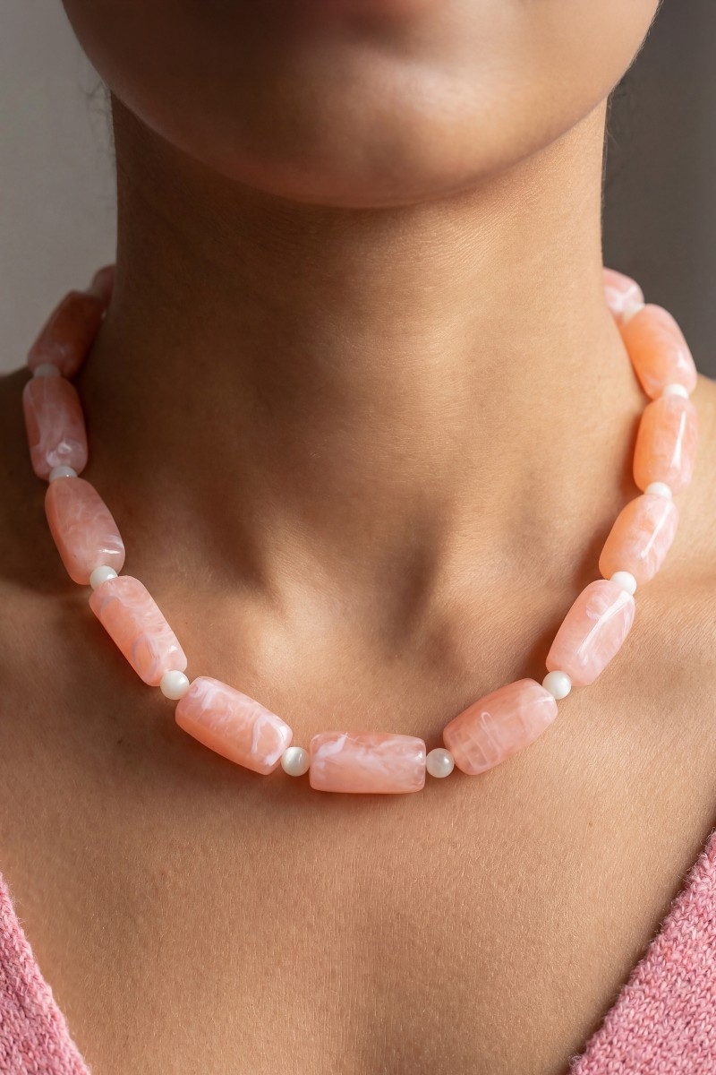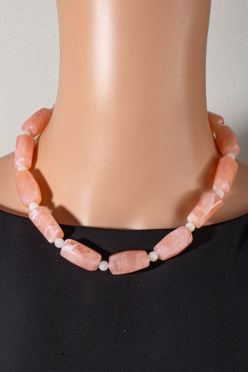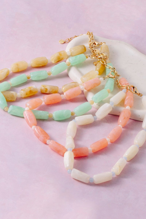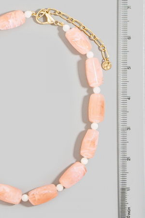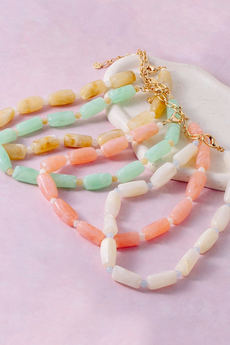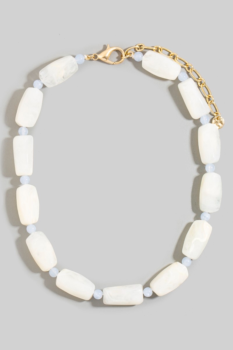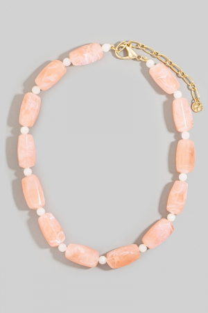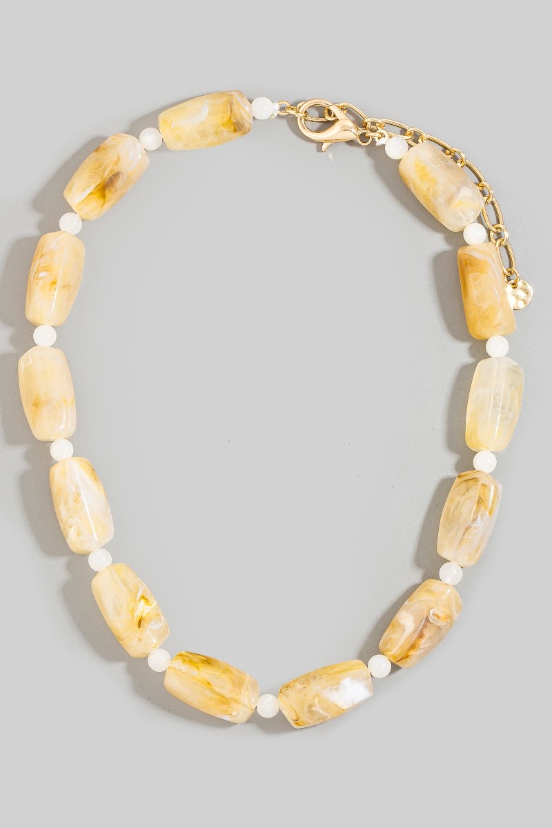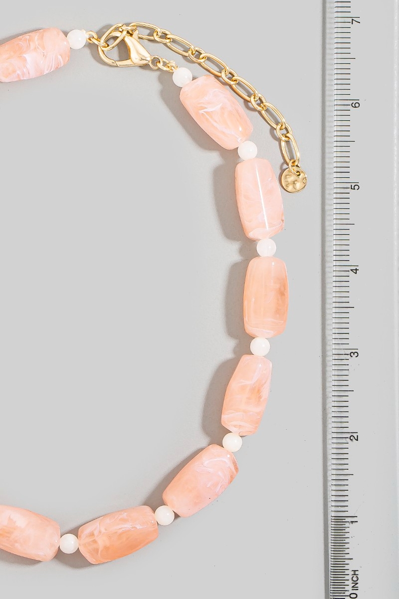 - This necklace introduces a unique marble acrylic beaded style. Experience a subtle blend of modernity and classic charm as this necklace effortlessly adorns your ensemble.