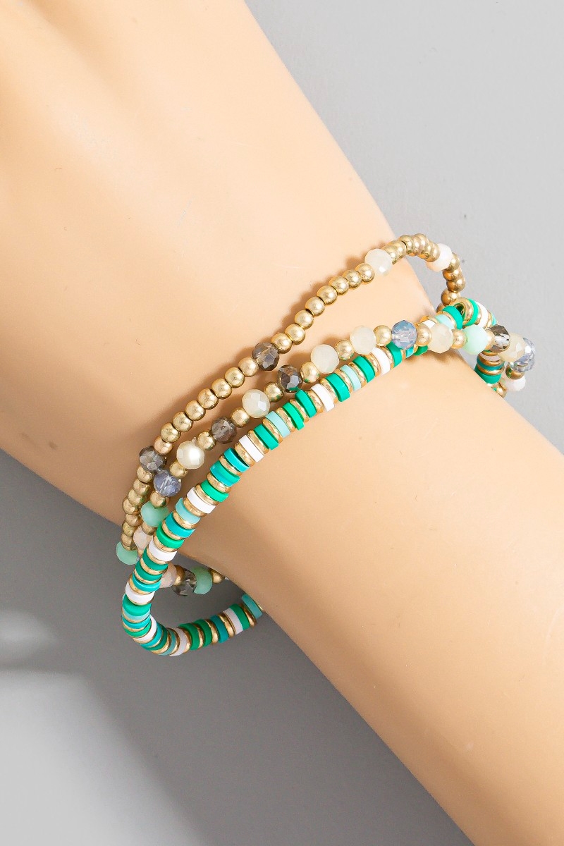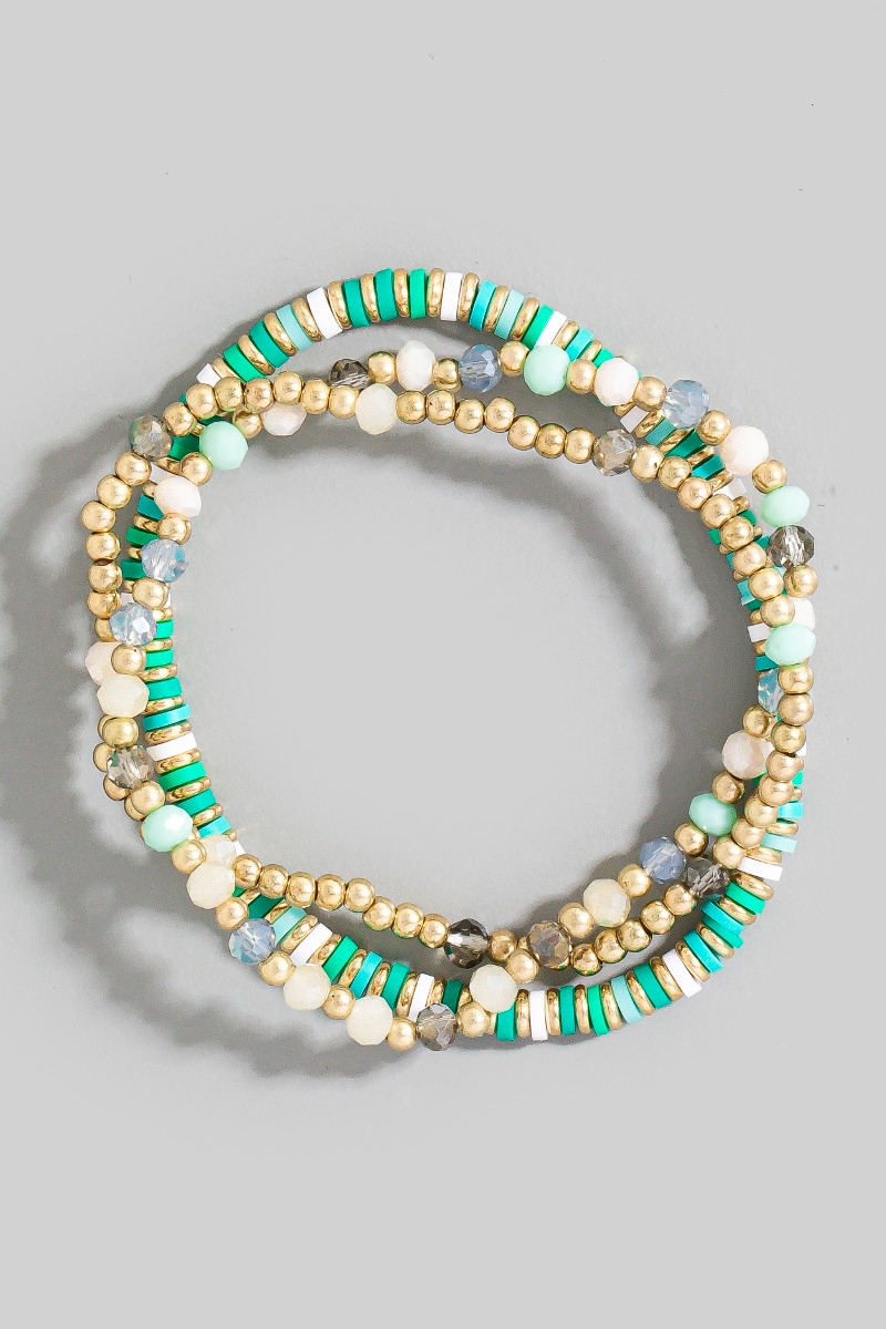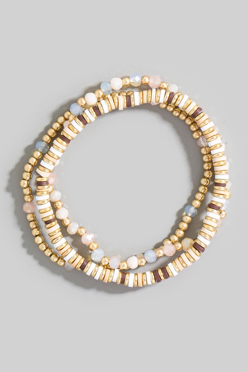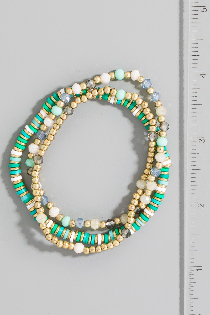 • This bracelet adds a modern mixed metallic faceted and disc beaded set style. Experience a subtle blend of modernity and classic charm as this bracelet effortlessly adorns your ensemble.